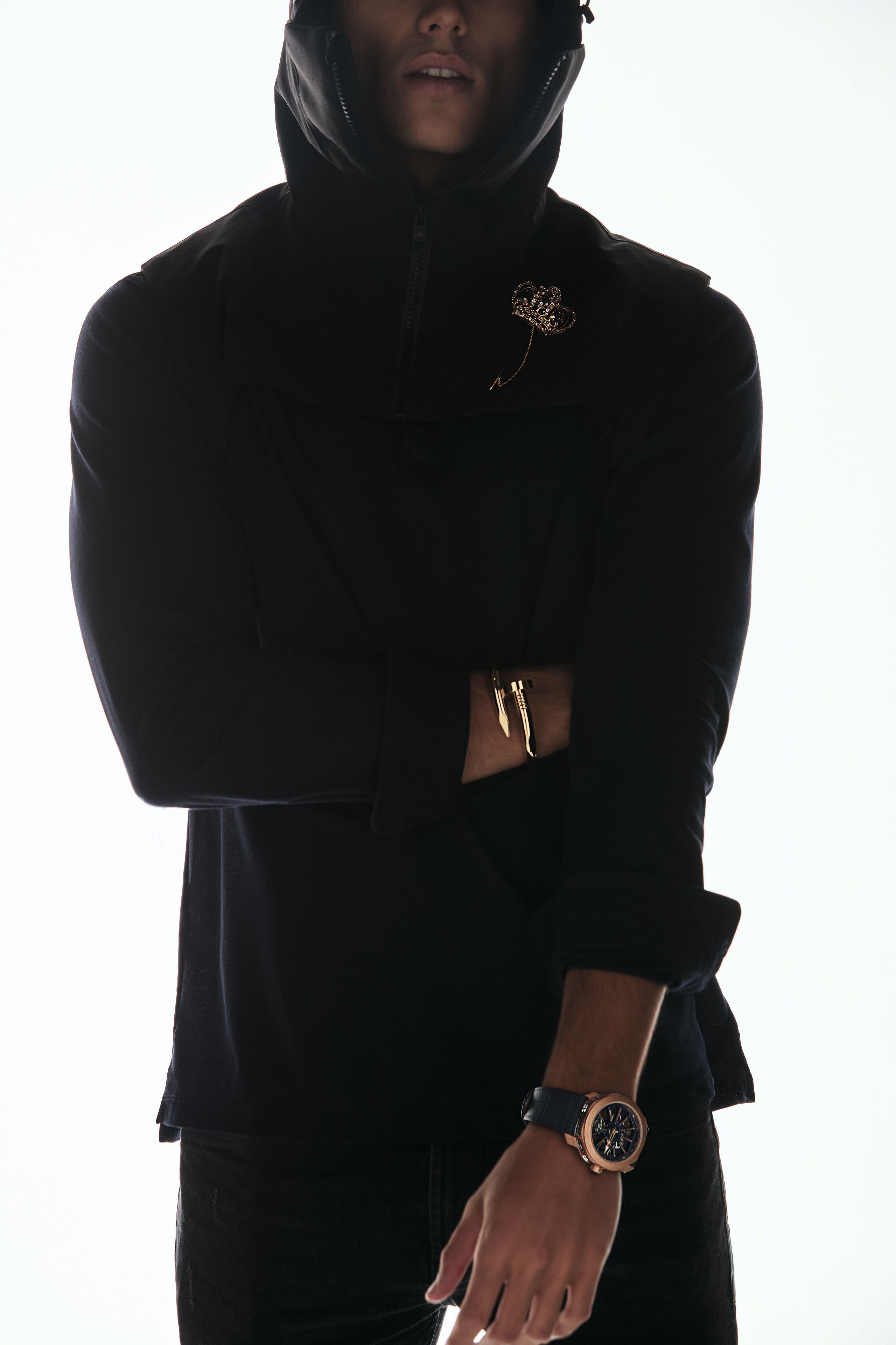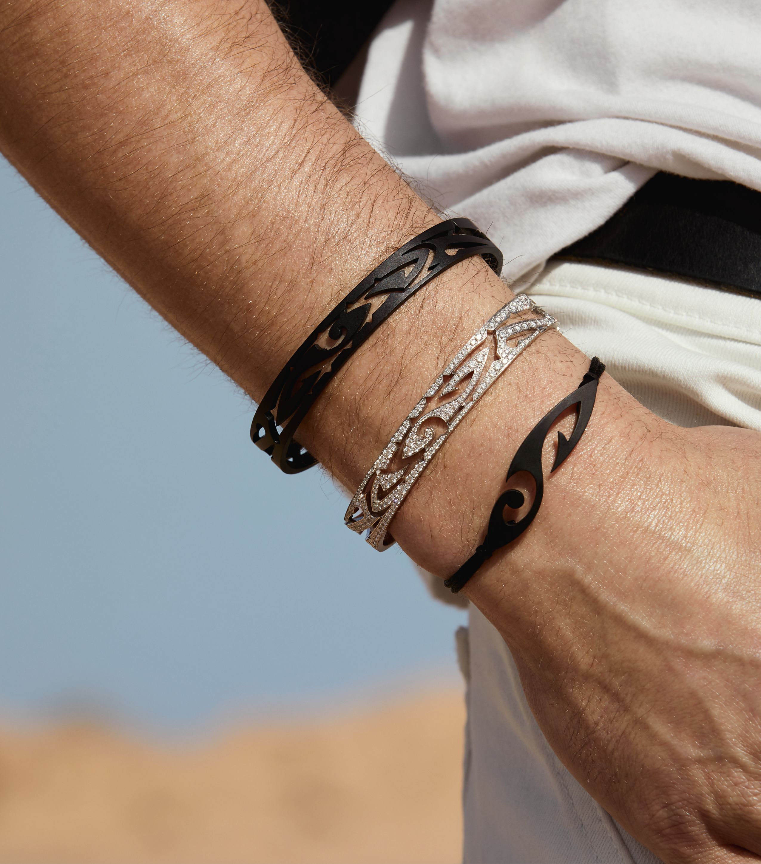 “Titanium is very hard, and very hard to work with, so to get a beautiful diamond encrustation, this is the worst material to work with. We had to test and test, and we are the first ones to make a series with titanium. The good thing about it is that the volume can be big, and it is light. And it’s cool, because you don’t feel it. Men don’t like to be annoyed with wearing lots of bracelets.”