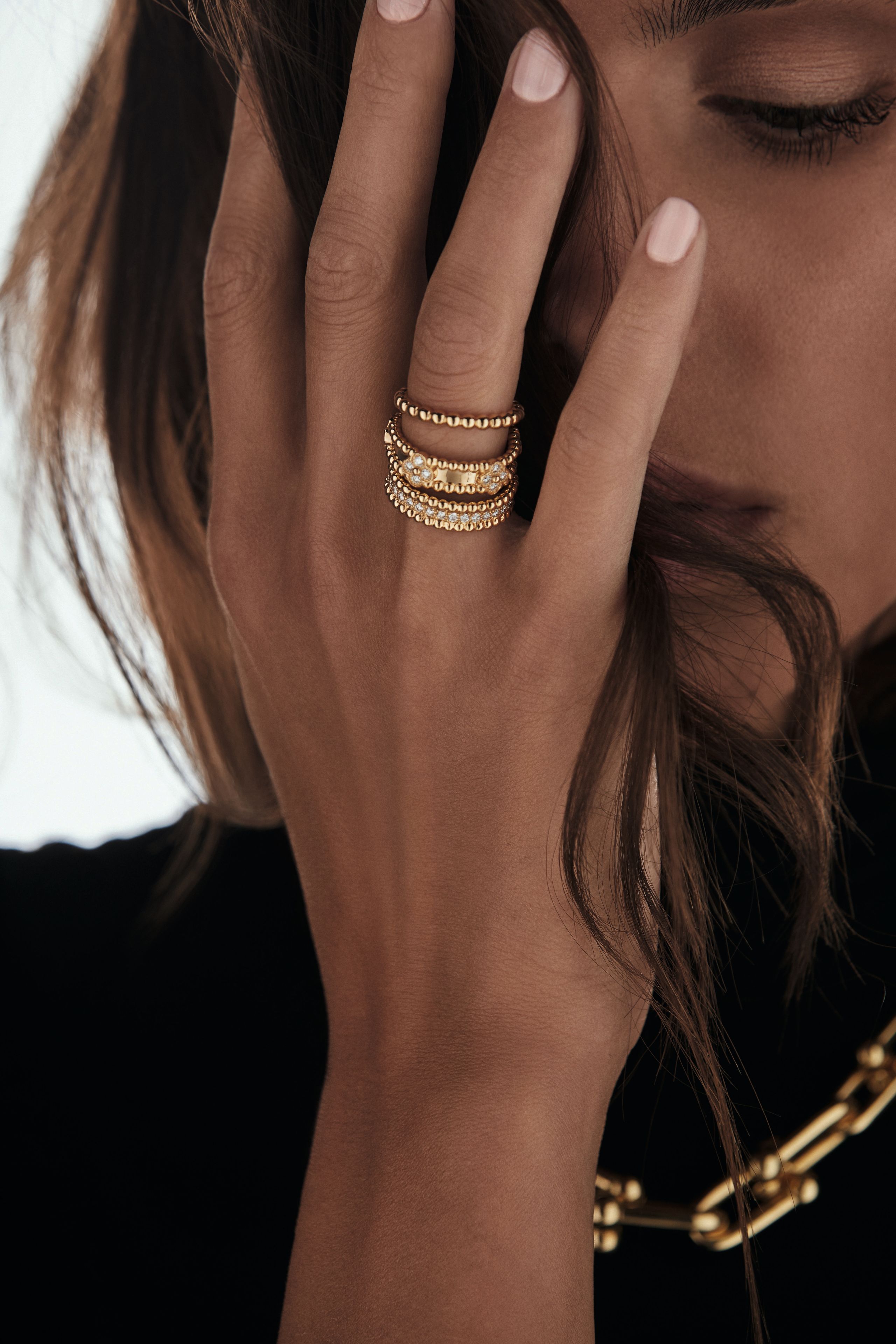 From top, Perlée ring in yellow gold, Dh4,650; Perlée Sweet Clovers ring in yellow gold and diamonds, Dh26,100; Perlée Diamonds ring in yellow gold, Dh28,500, all from Van Cleef & Arpels. Graduated link necklace, Dh45,400, Tiffany & Co
