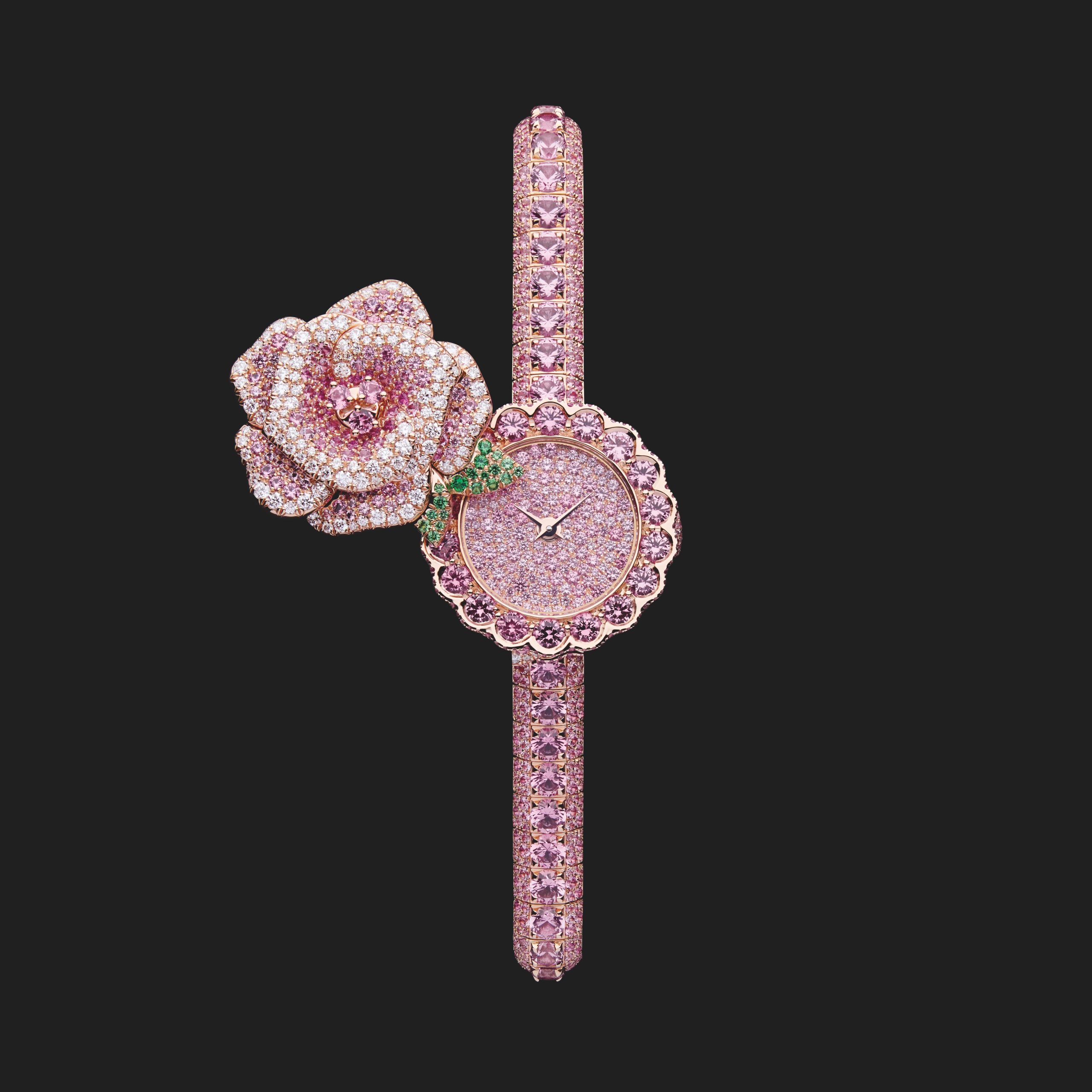 Some designers make the most use of pink gemstones as part of a vibrant colour palette. Lucia Silvestri at Bulgari and Victoire de Castellane at Dior share an artist’s eye for divine colour combinations, either balancing tones or creating eye-catching contrasts. The recently unveiled Rose Dior high jewellery collection makes flattering use of spinels and pink sapphires, which have become particularly popular in recent years. They’ve been pavé-set across necklaces, earrings and a secret watch shaped like Christian Dior’s favourite flower.
