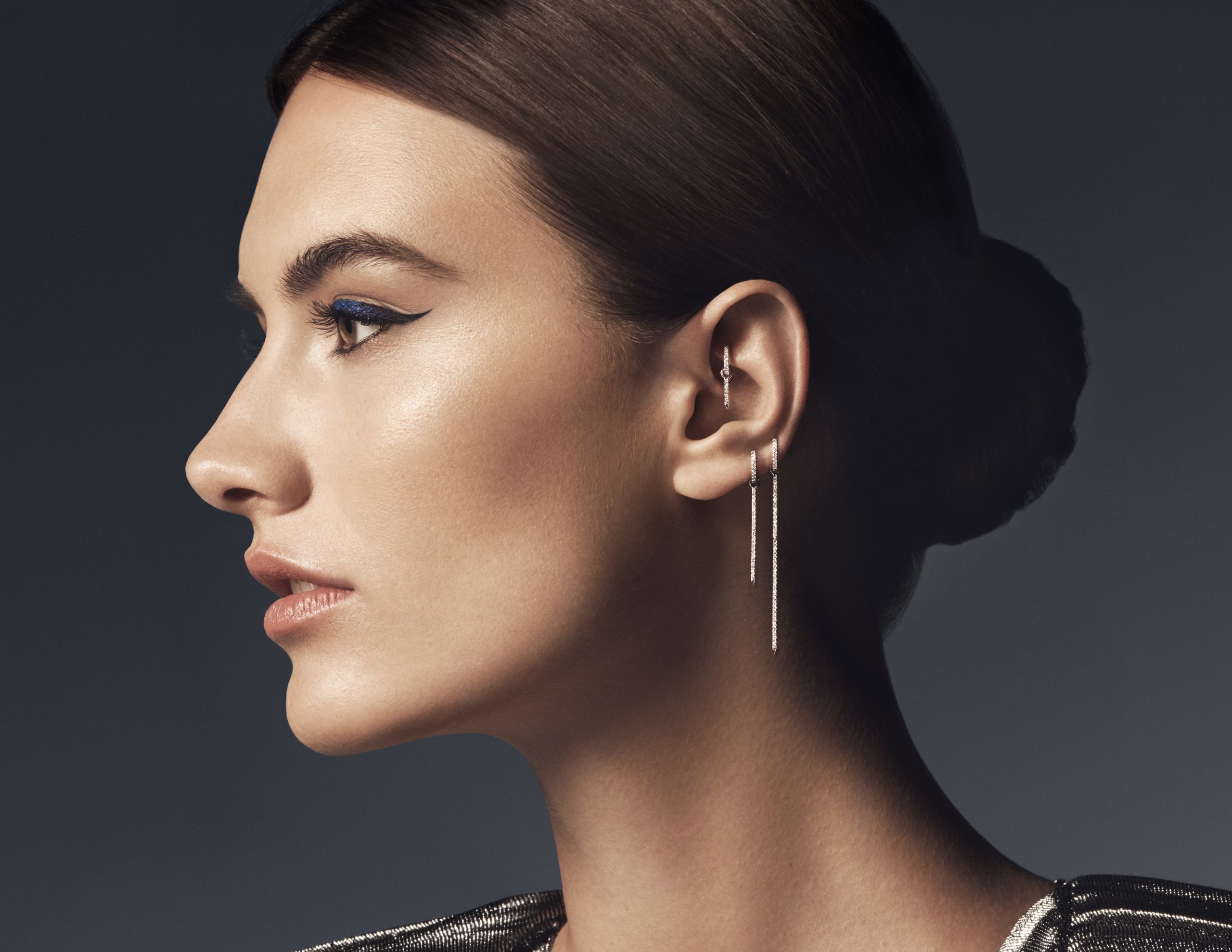 Most recently, Tash has debuted the Tash Rook piercing, where the entry point, as well as the wearable components of the jewellery, are all concealed under the ridge of the rook, or the uppermost ridge of the inner ear, allowing the pieces to cascade over the conch; and the Tash Helix, where the entry point is hidden under the upper fold of the helix, the upper cartilage of the ear.