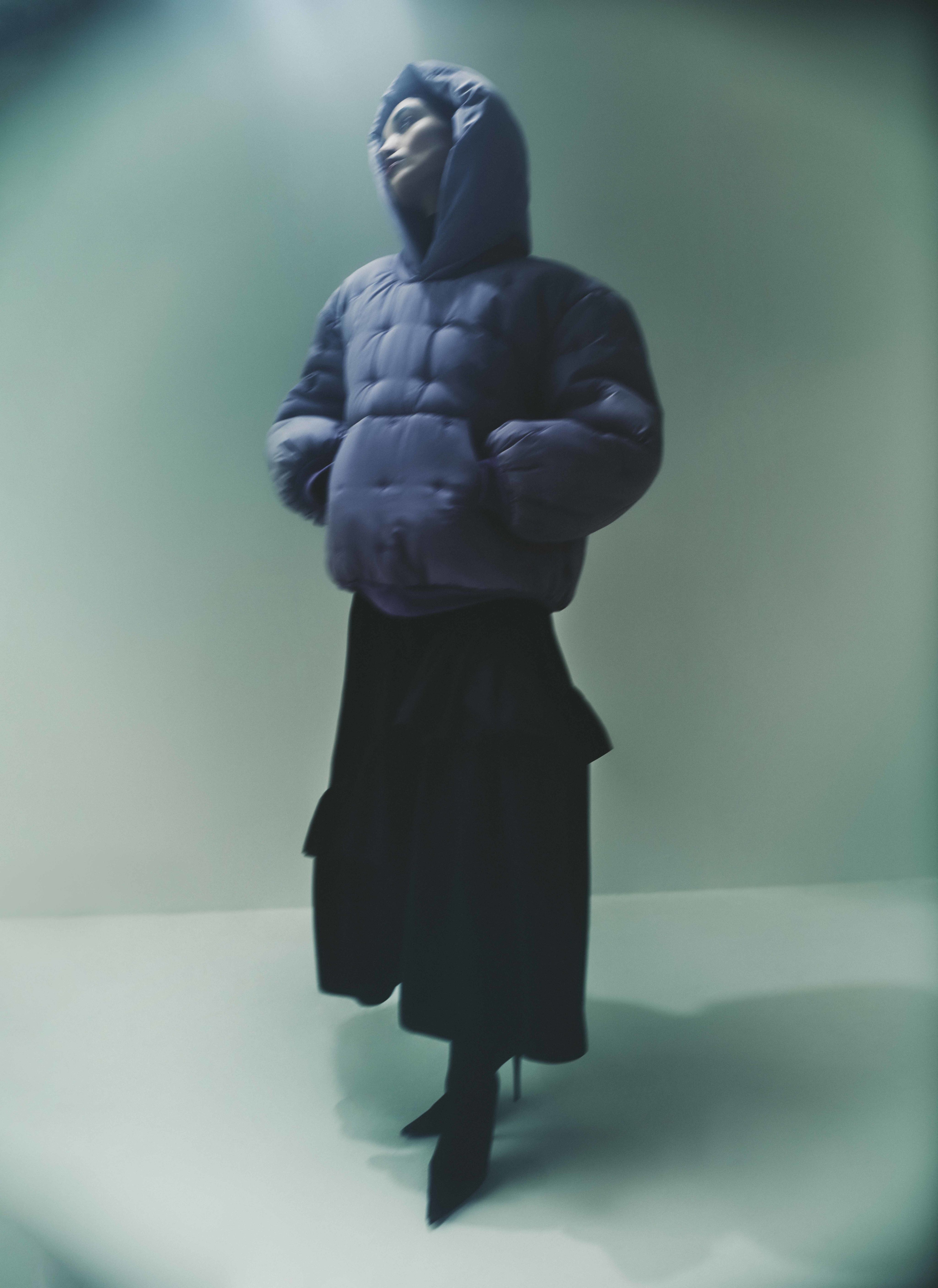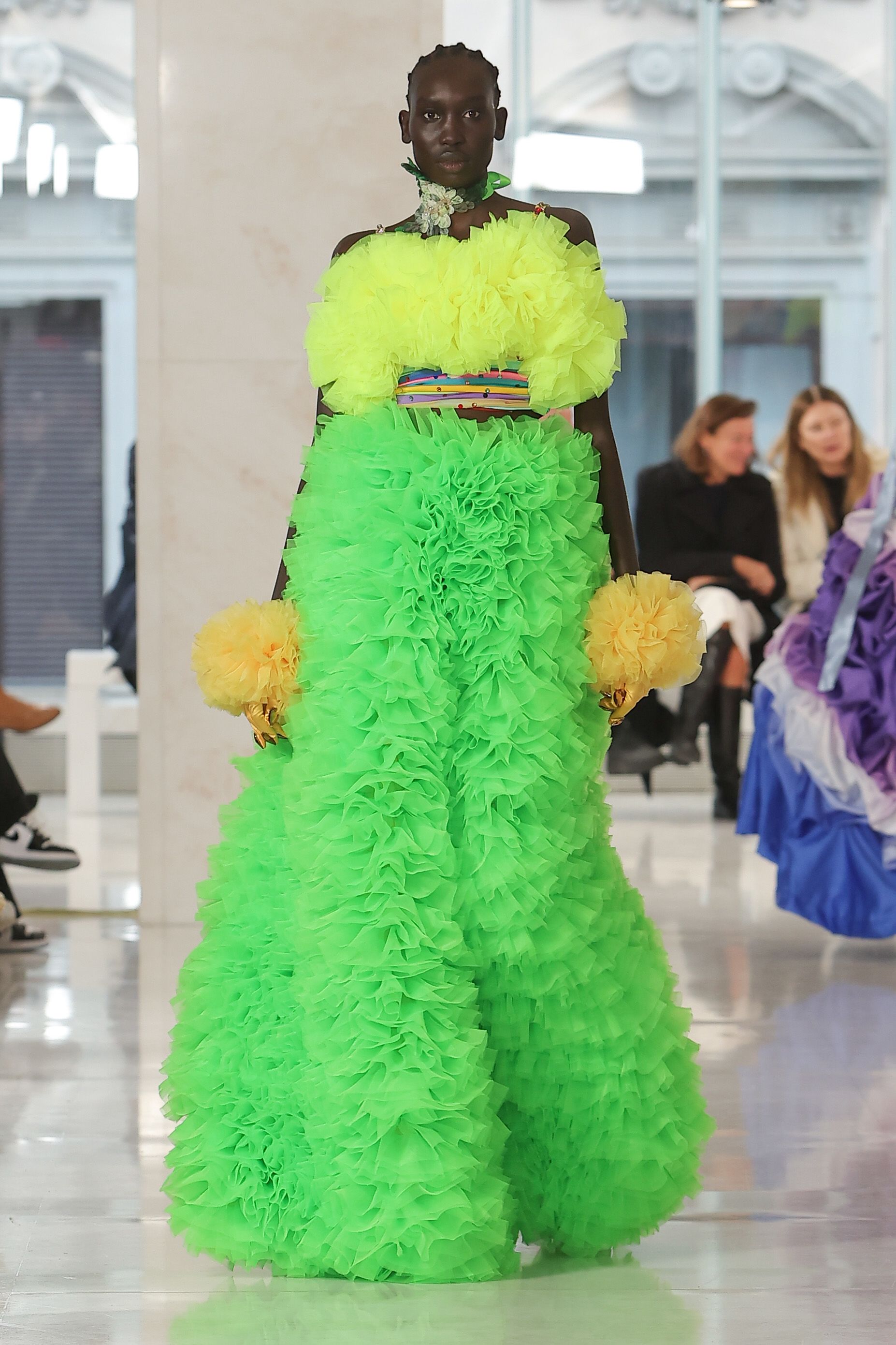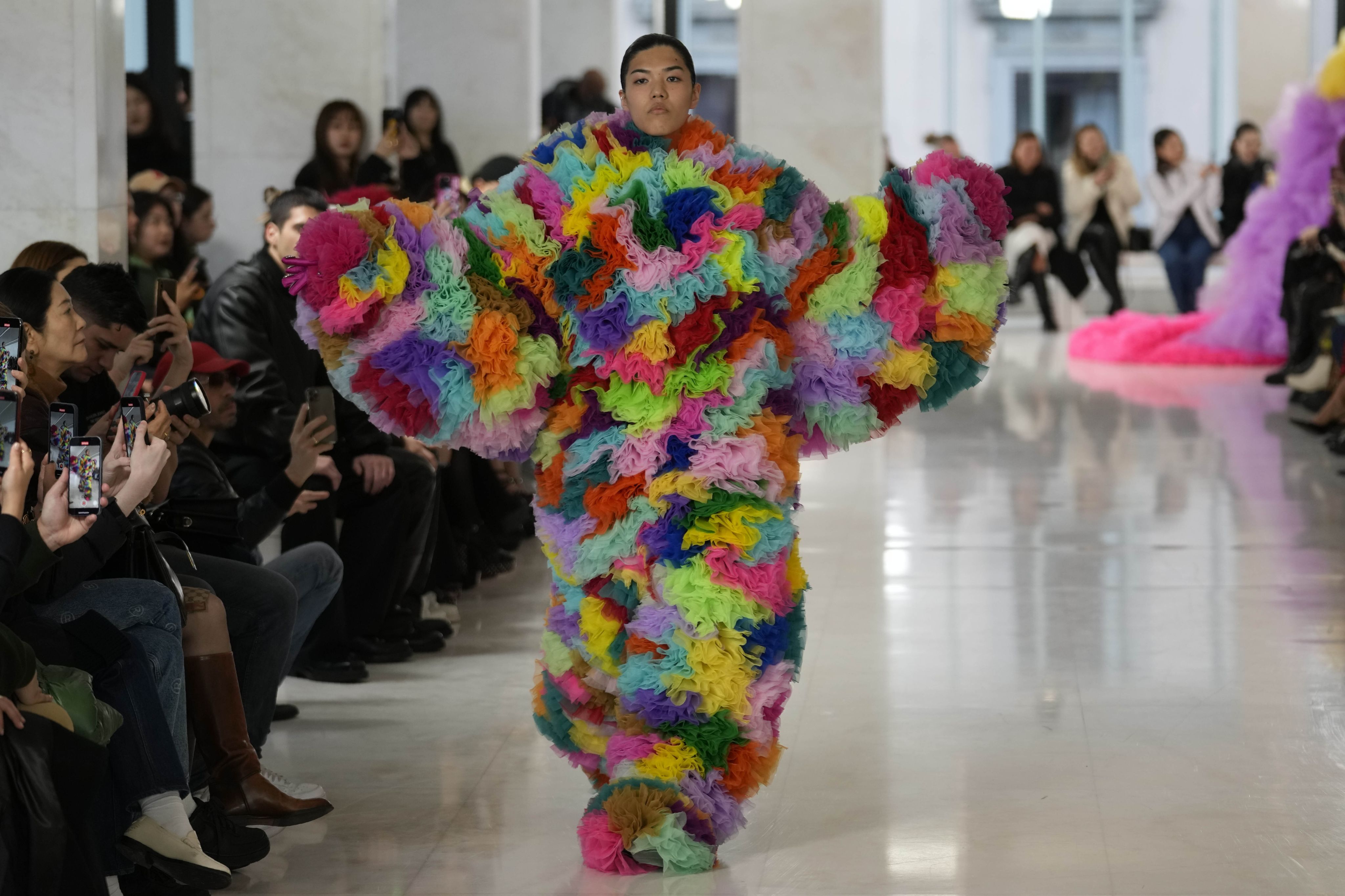 Three days after we speak, the audience is grinning ear to ear as Koizumi’s show unfolds and, as the final look arrives, the crowd bursts into cheers and applause. The big, rainbow “blanket” I had seen in the studio has been transformed into a giant, colourful caterpillar – a singular look worn by five models.