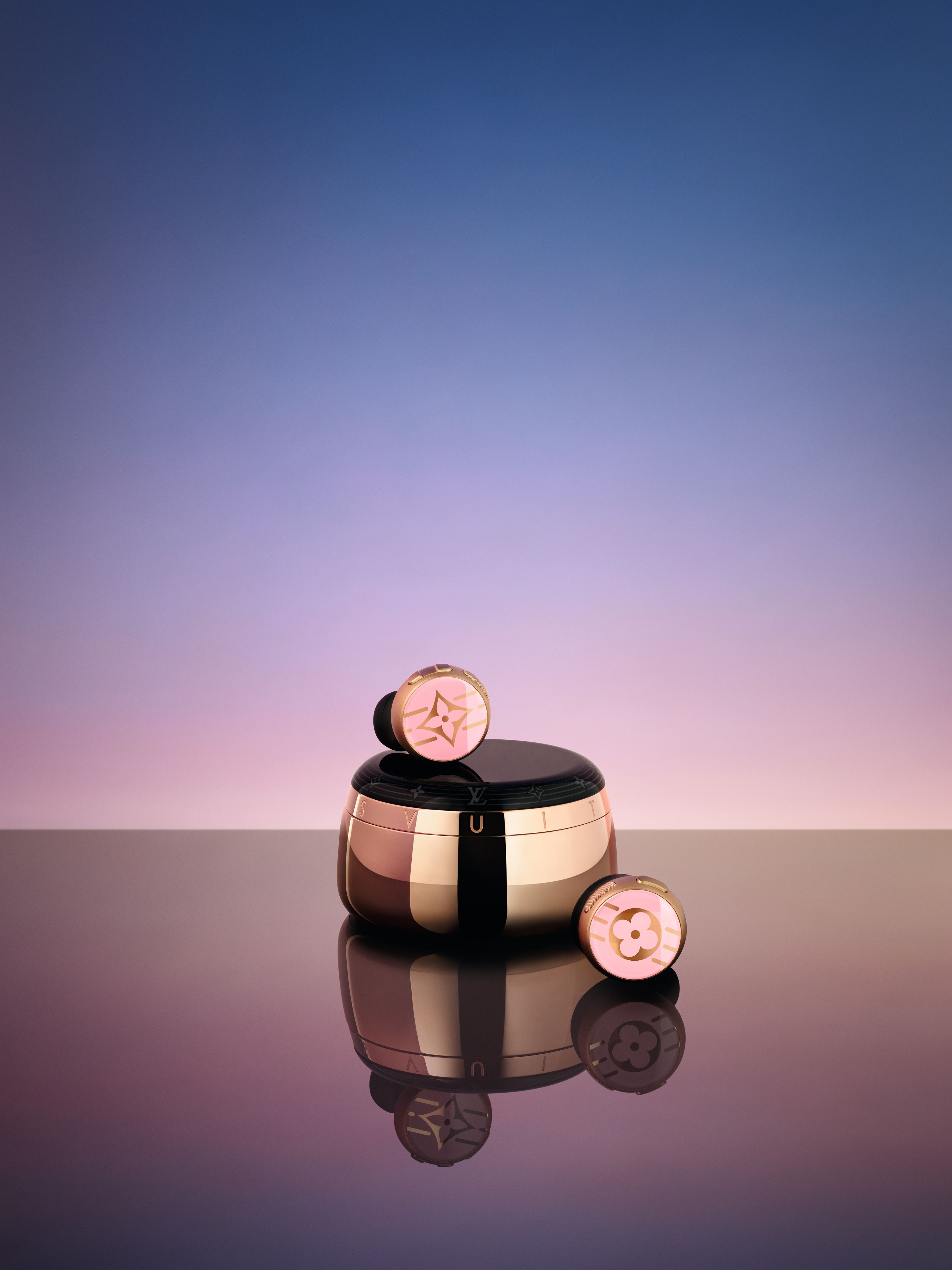 Louis Vuitton has unveiled the third generation of its Horizon Light Up wireless earphones. Built around a lightweight aluminium frame, the earphones are finished with a layer of polished sapphire dotted with LV’s signature Connected Monogram floral motif. There are five new models available – a core collection of matte black, yellow gold and pink, as well as two limited-edition hues, festive red and a gradation of violet and blue. They come in a curvaceous charging case inspired by the Louis Vuitton Tambour watch case, also decorated with the monogram pattern, backlit with LEDs that indicate battery levels.