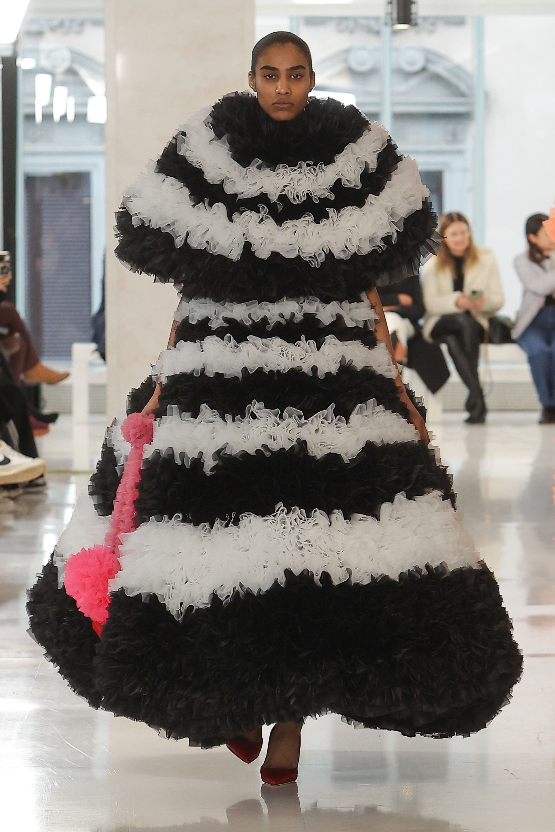 The piece, aptly named The Biggest Dress, is theatrically oversized and made from more than 200 metres of bright pink organza, packed into tight folds. “It’s quite heavy. When you wear it it’s fine, but when you hold it, it’s heavy.”