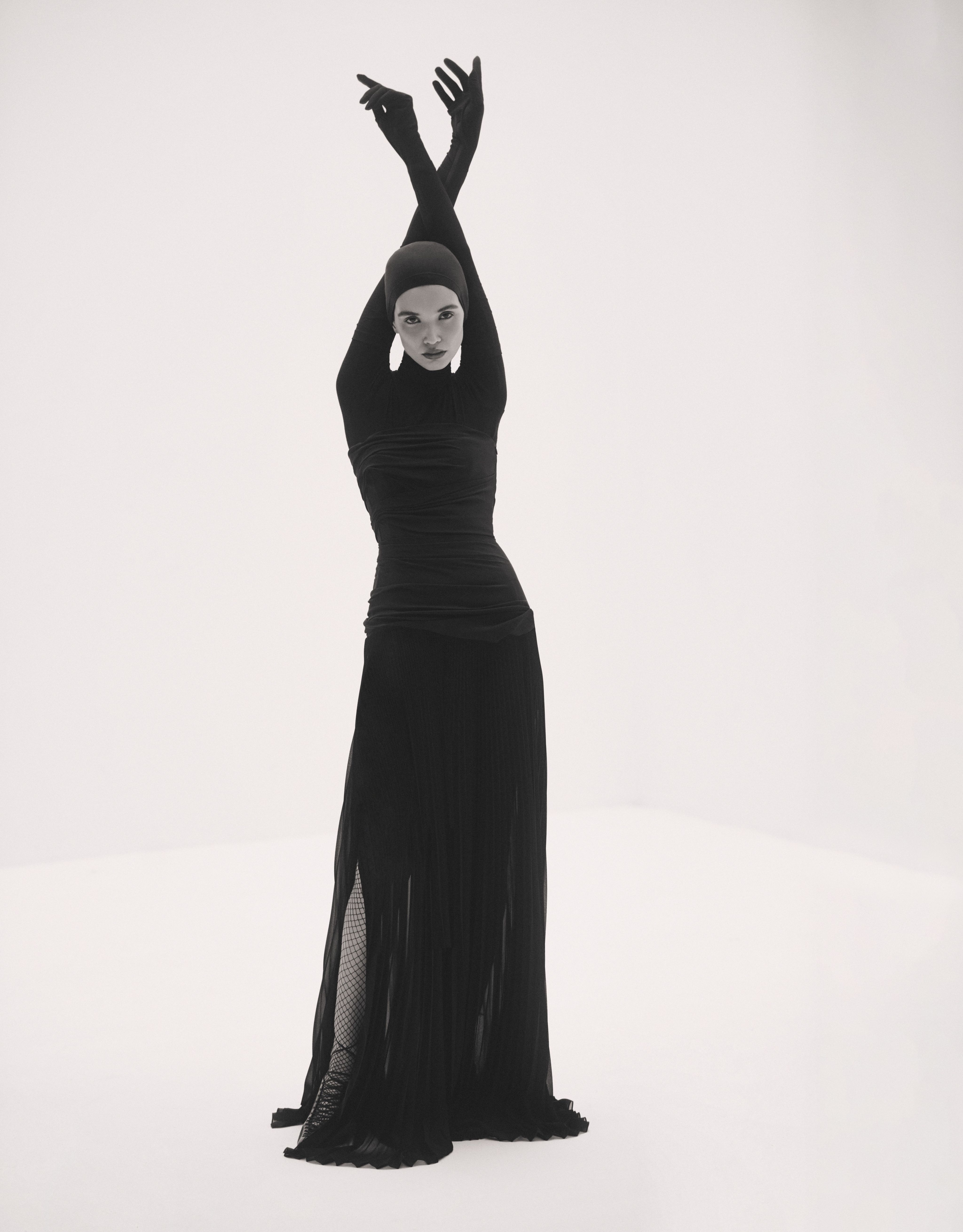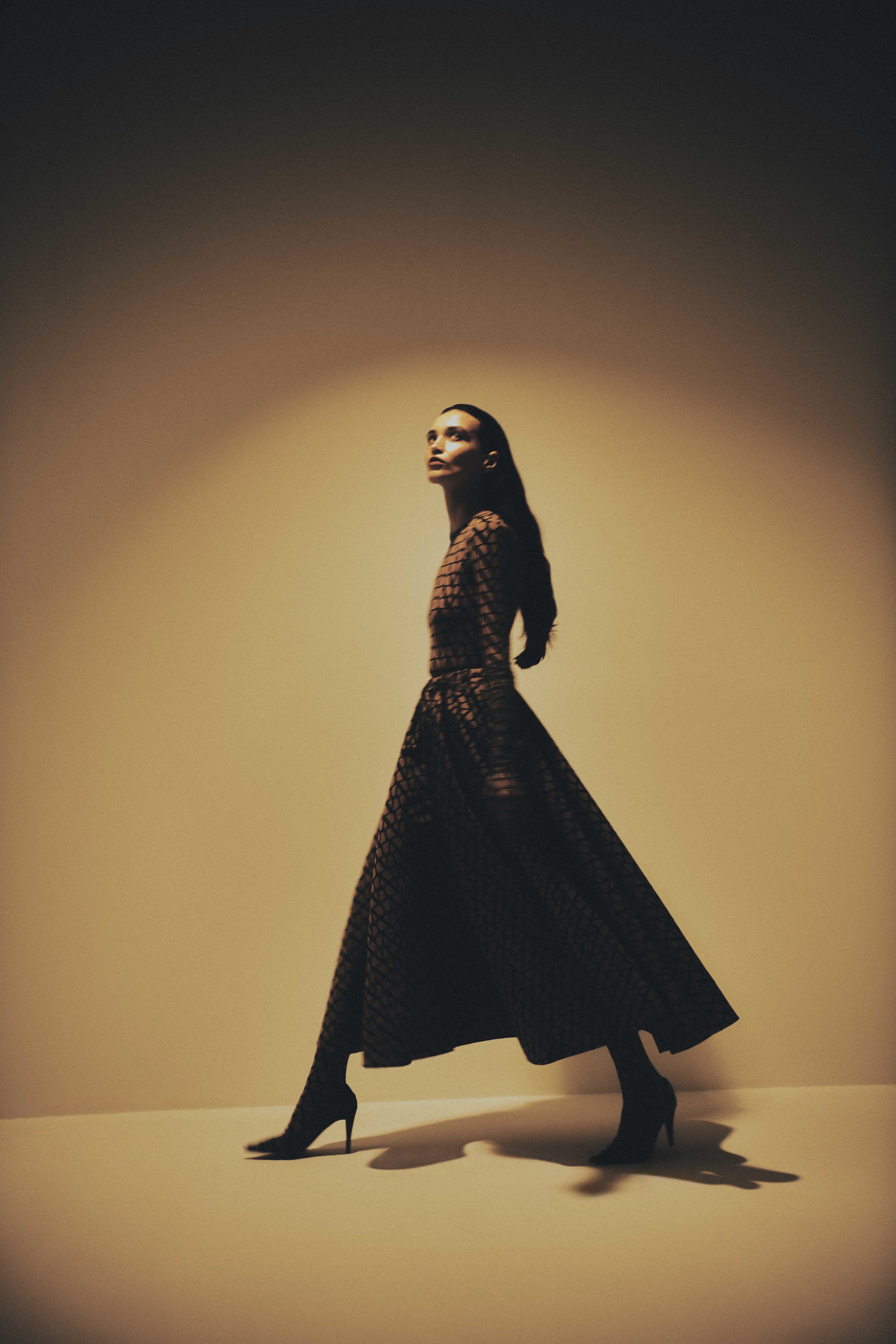 Dress and shoes, price on request, Dior. Hat, Dh3,140, Loro Piana. Top, tights and sheer scarf, stylist’s own