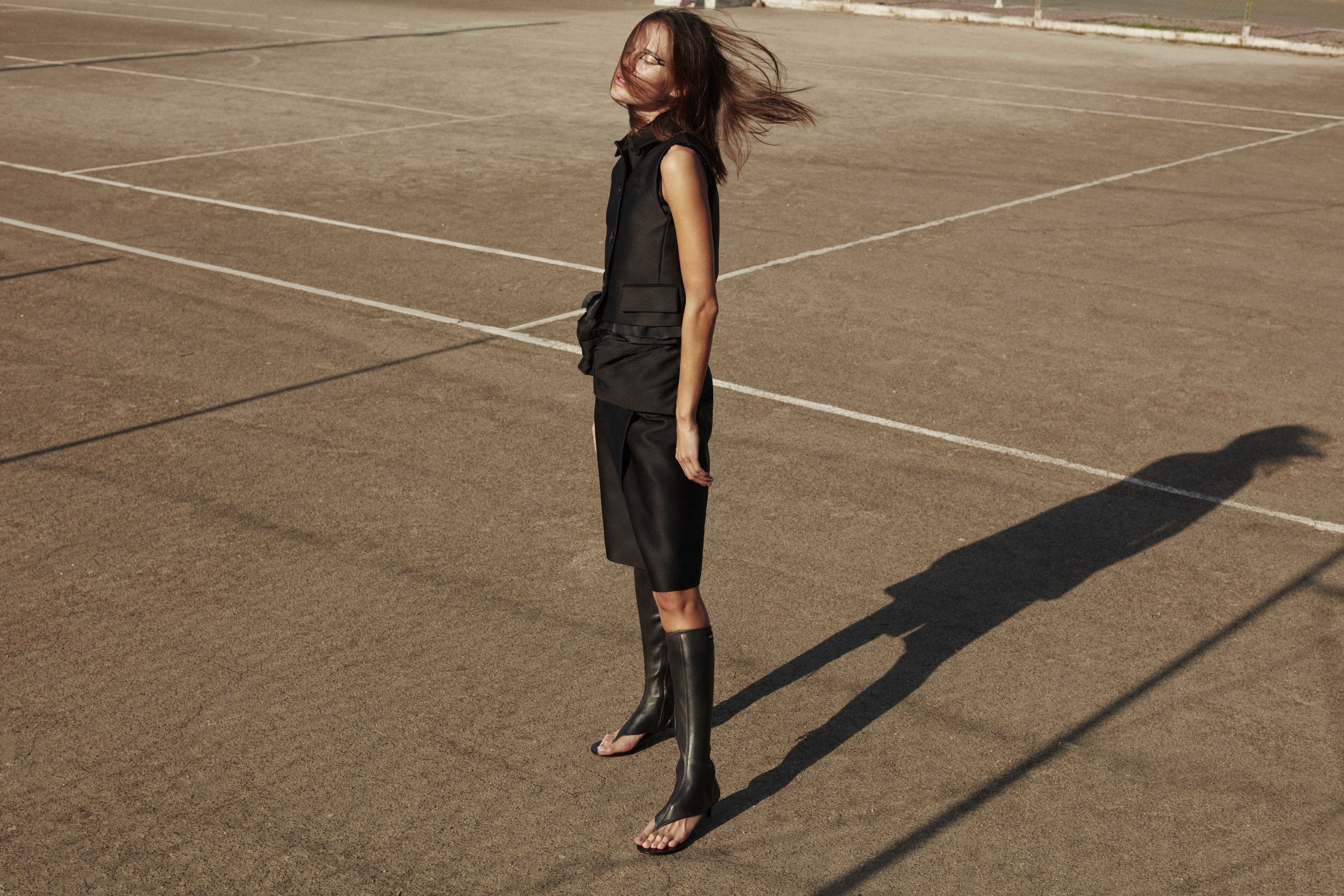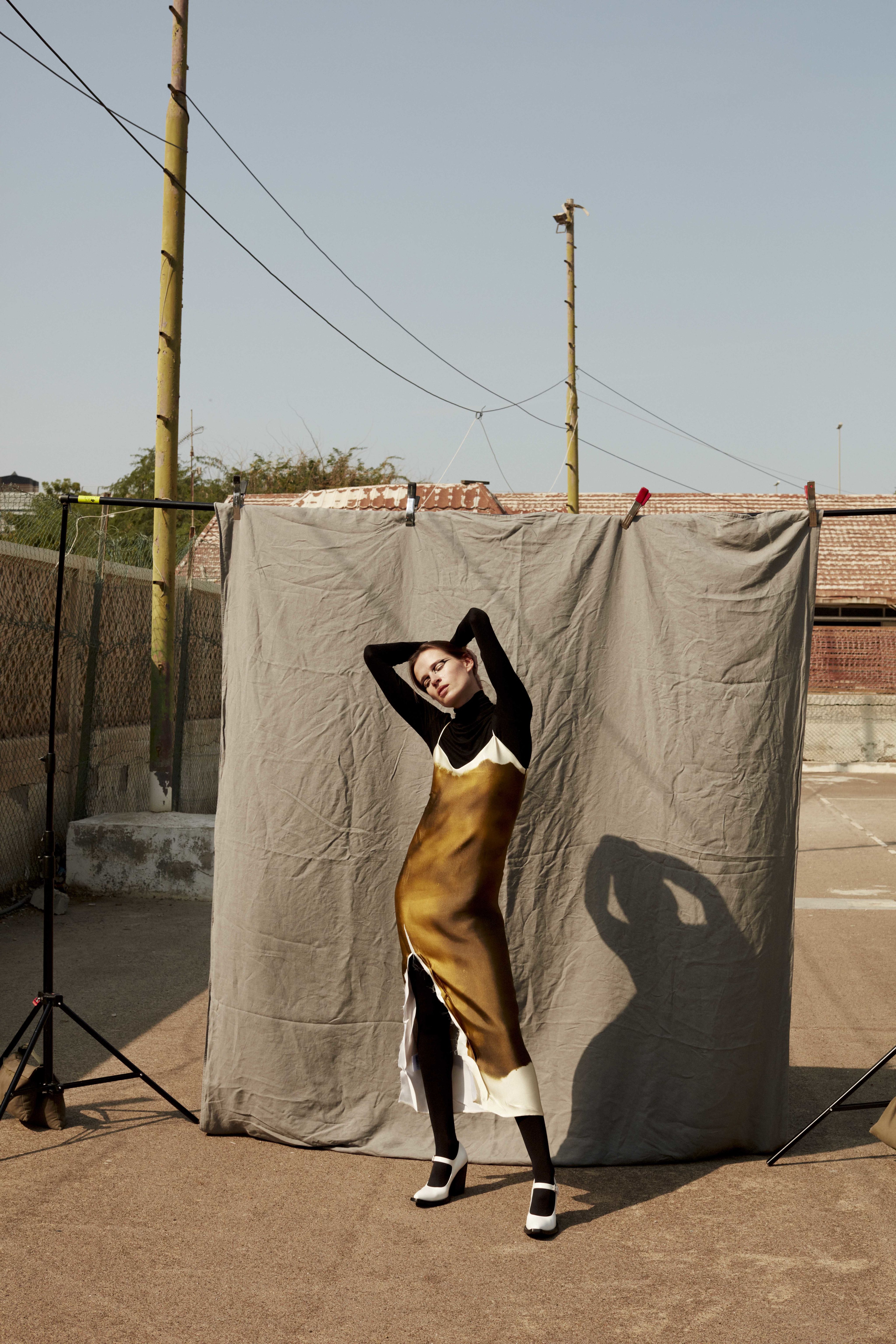 Dress; and shoes, both price on request, Prada. Black polo neck (worn throughout), stylist’s own
