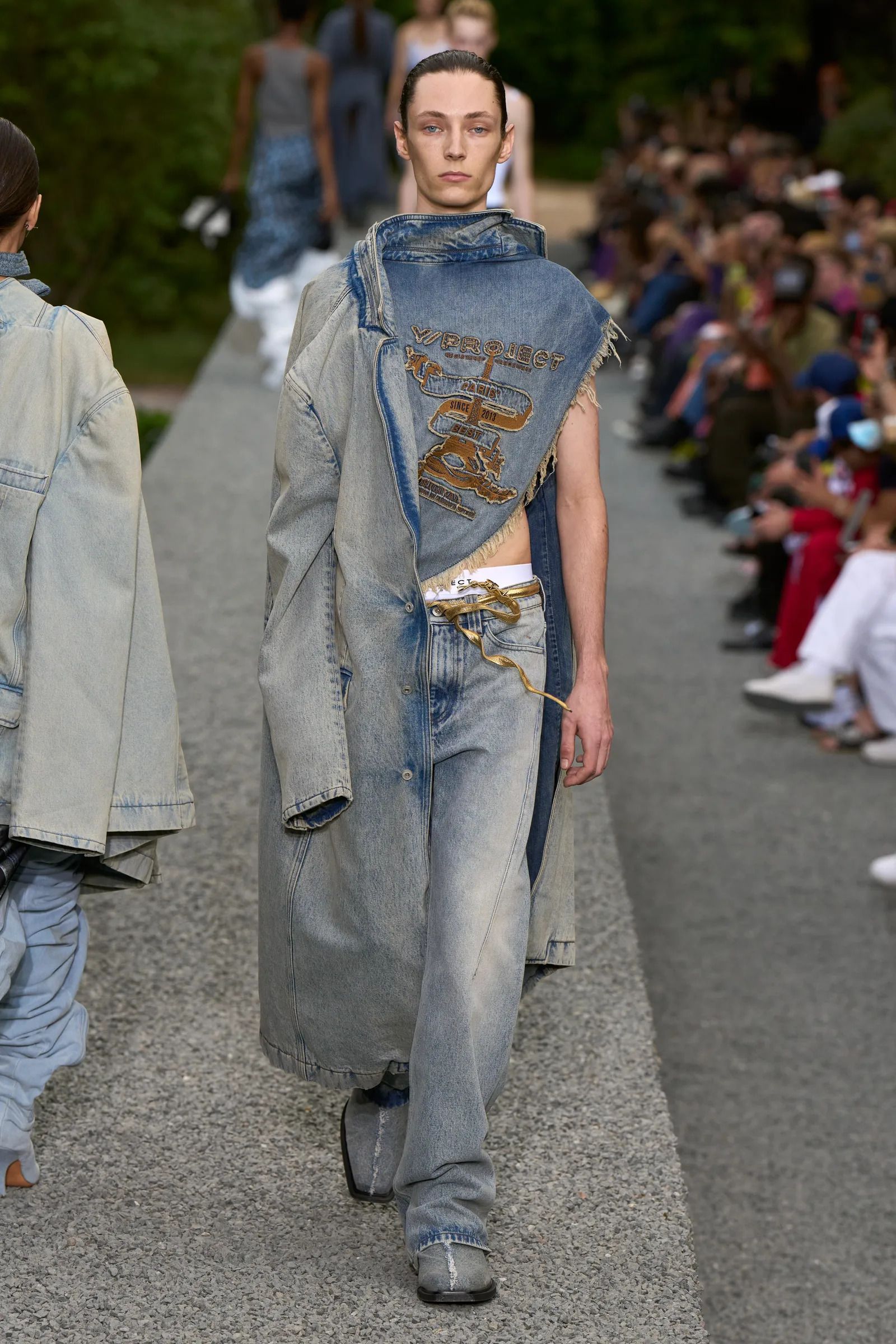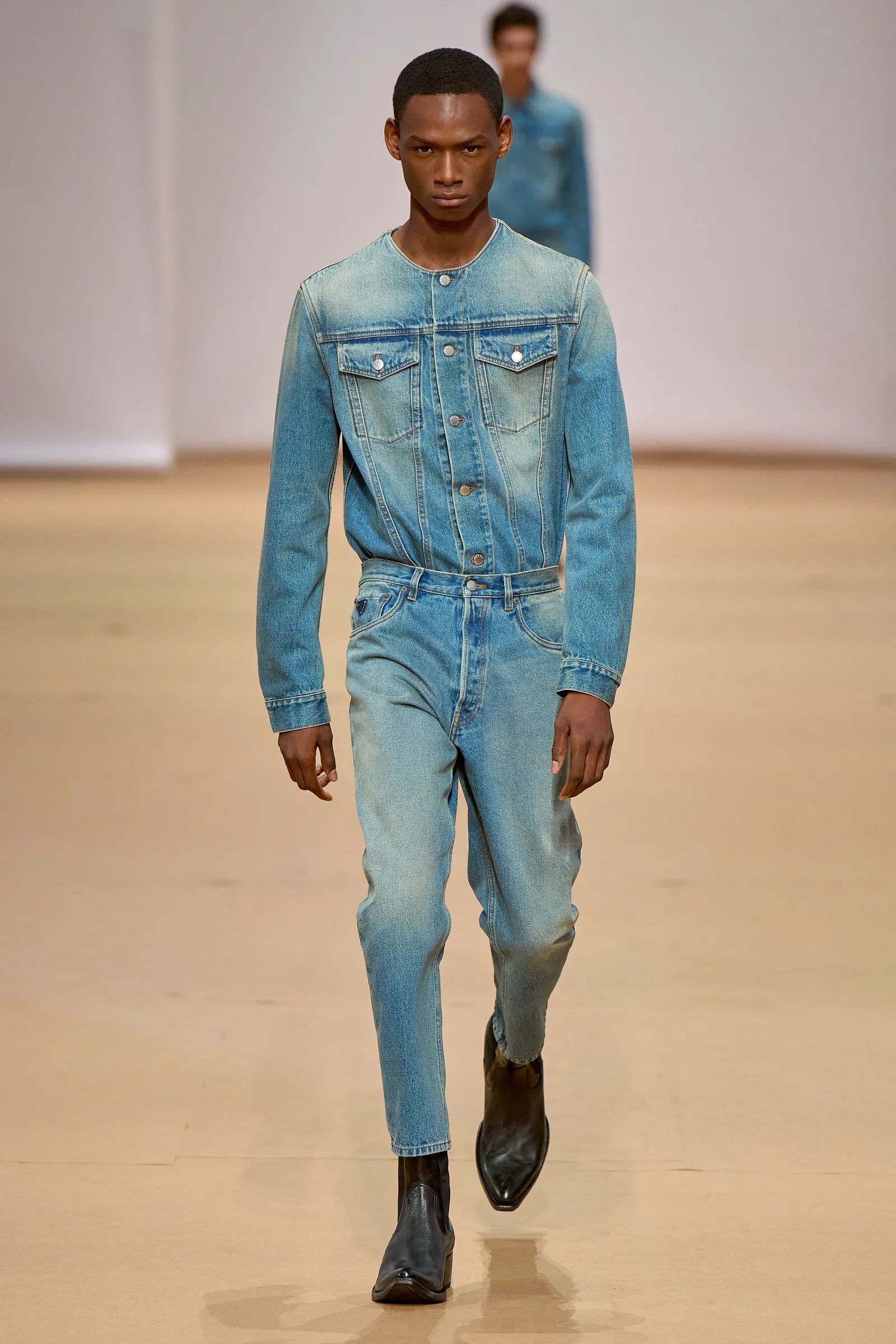 The brand showed that double denim is not only for women this season, wrapping men in pale wash jeans, caped tops and matching overcoats.