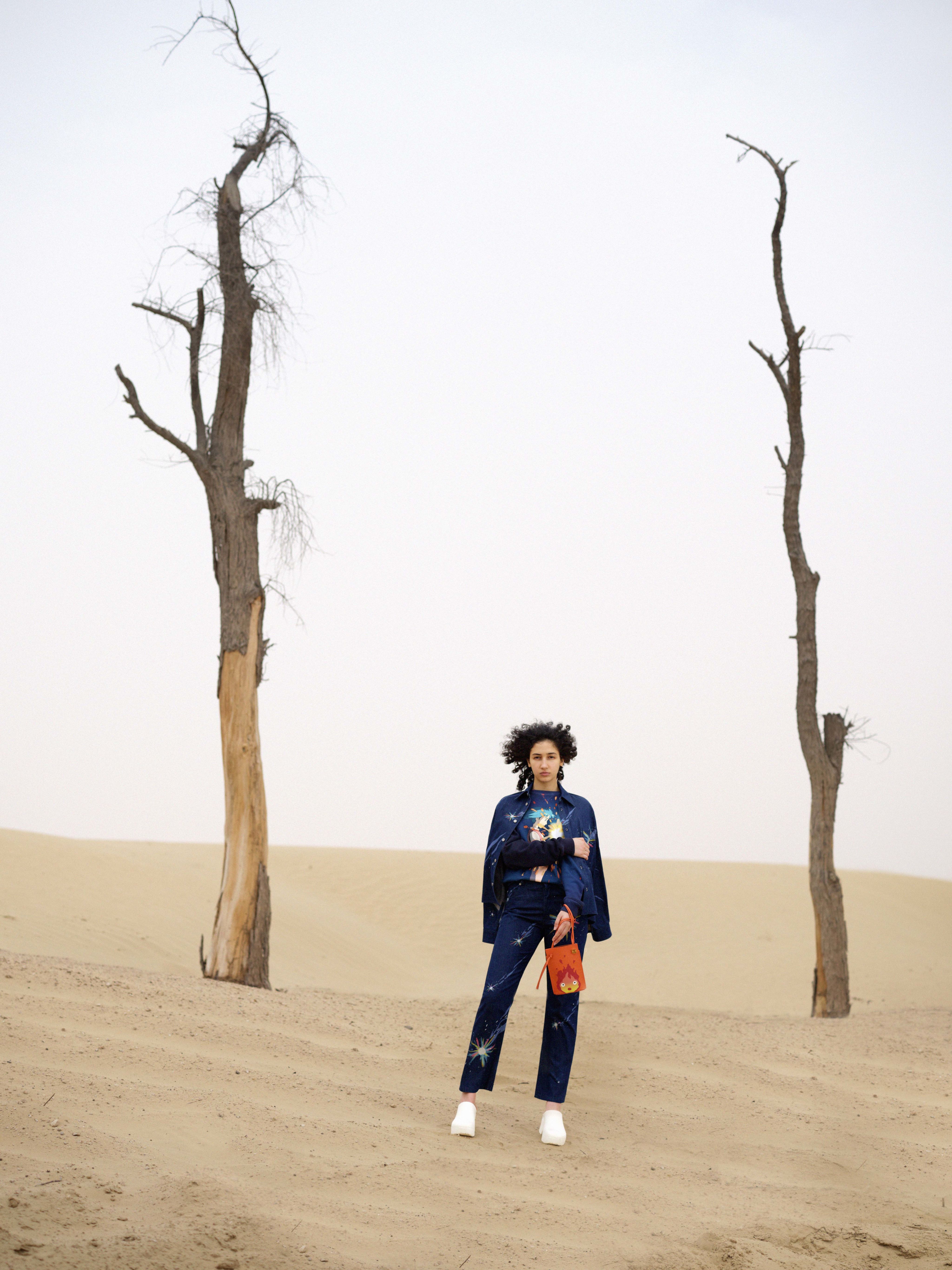 Magical Sky denim overshirt in cotton, Dh5,700. Magical Sky sweatshirt in cotton, Dh4,650. Magical Sky jeans in cotton, Dh4,200. Calcifer dice pocket bag in classic calfskin, Dh3,300. Terra foam clogs 90 in eva, Dh1,800