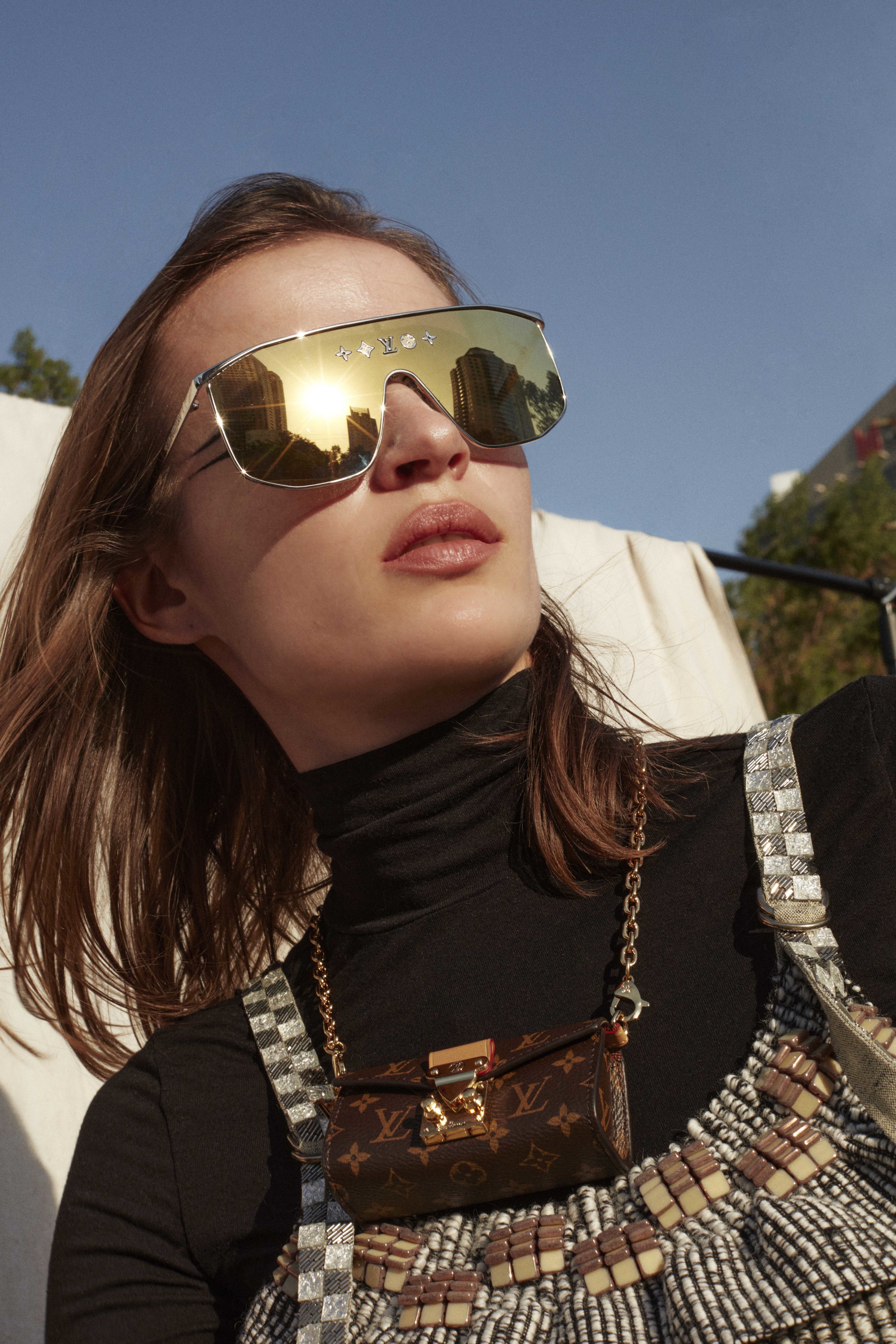Embroidered top, Dh9,700; sunglasses, Dh2,820; and Bitsy Pouch bag, Dh4,850, all from Louis Vuitton