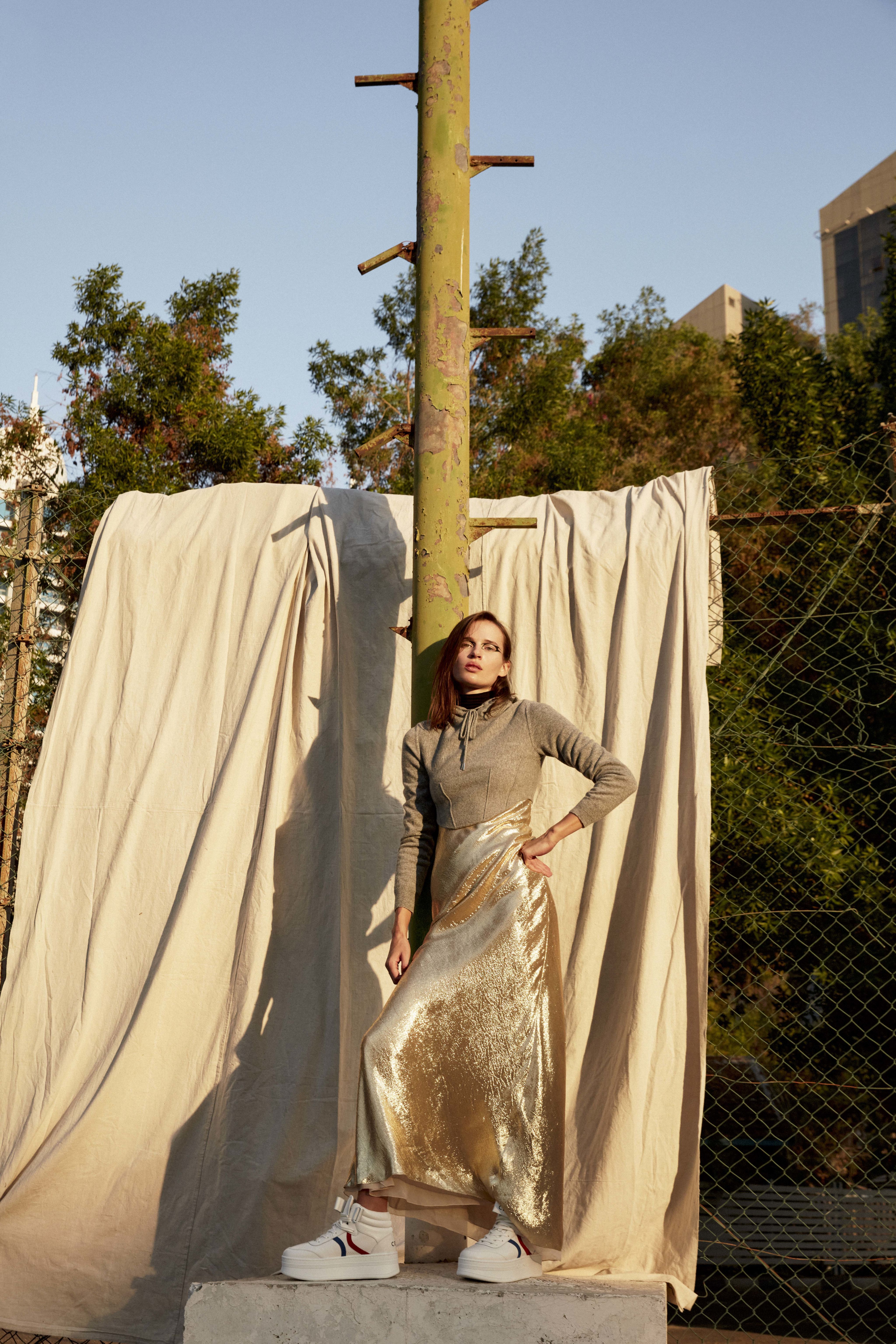 Hooded jumper, Dh6,300; lamé dress, Dh17,000; and trainers, Dh3,550, all from Celine by Hedi Slimane