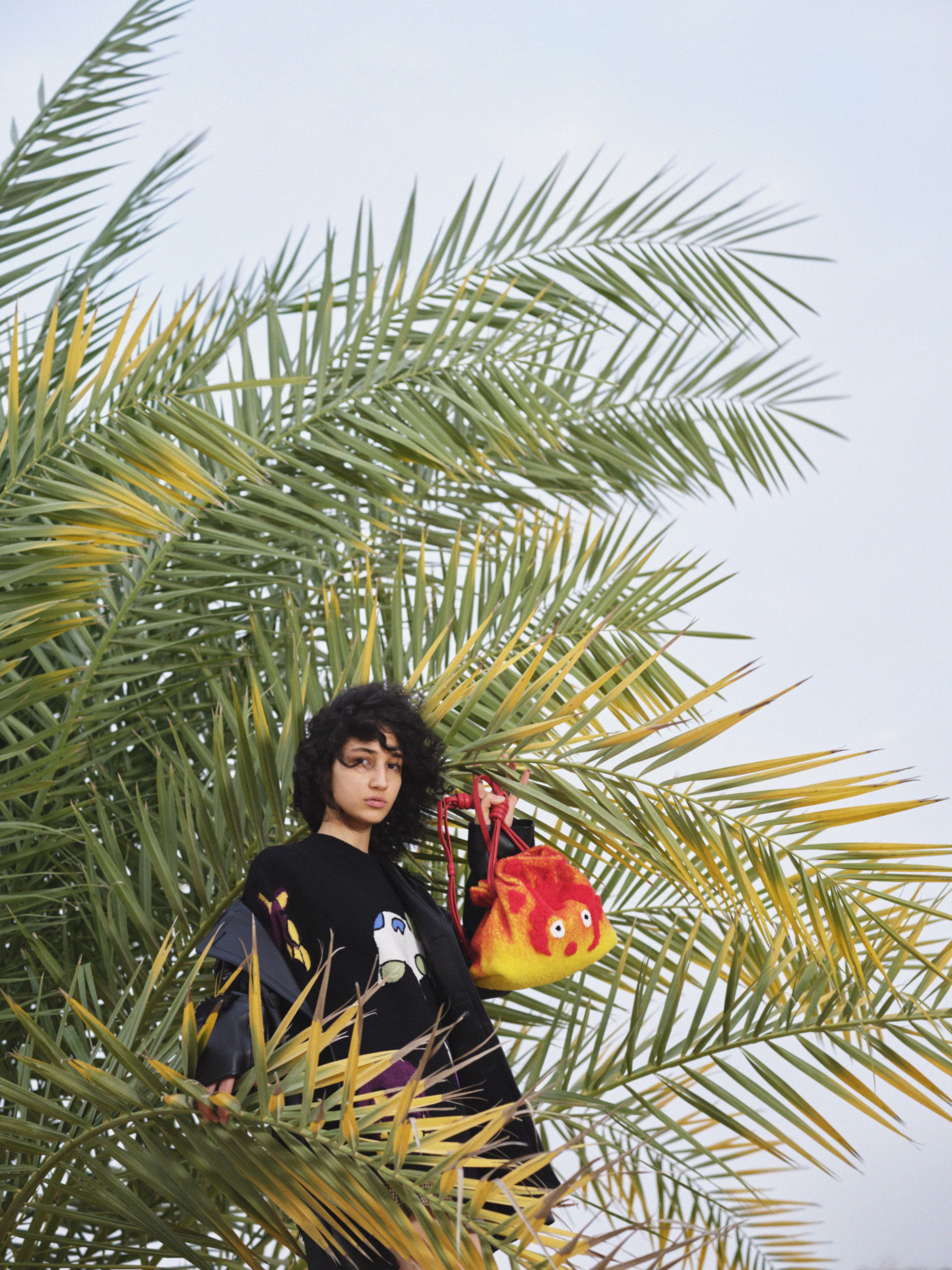 Witch polo sweater in wool, Dh4,500. Turnip Head sweater in wool, Dh5,700. Tailored trousers in wool, Dh3,750. Compact Calcifer Hammock bag in satin calfskin, Dh10,850