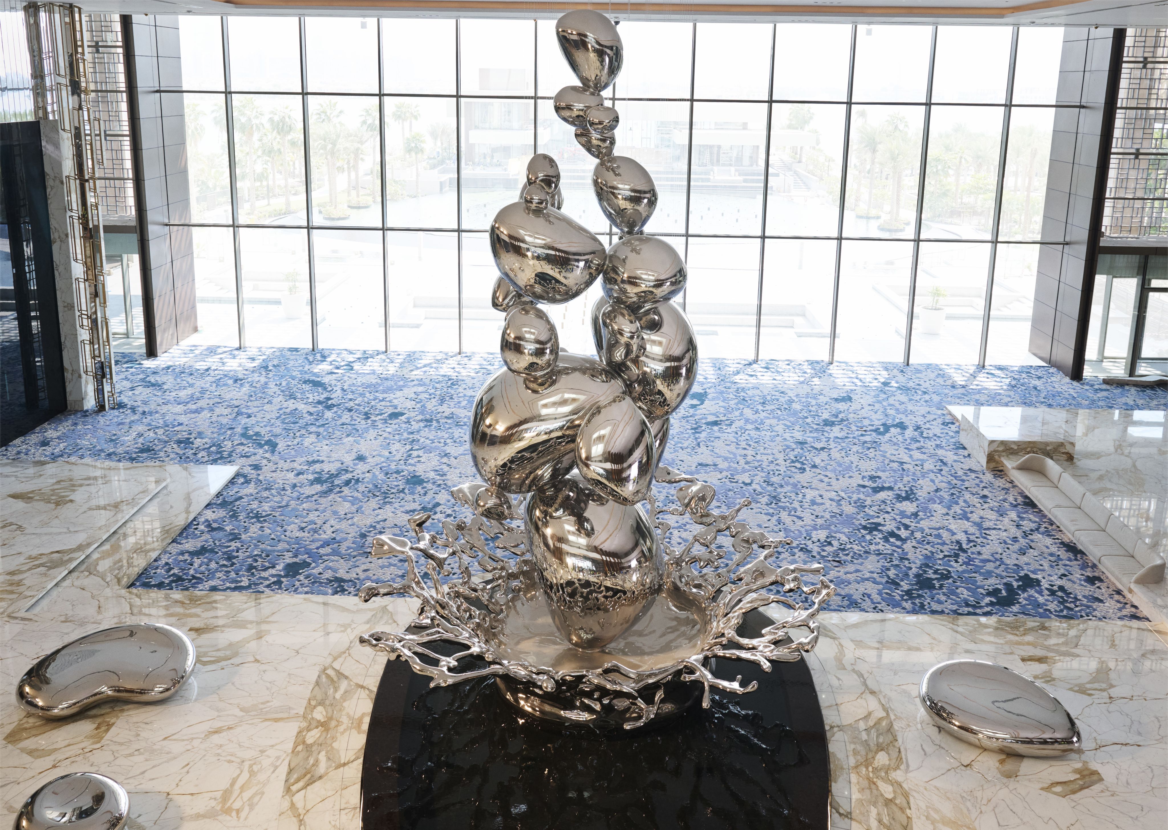 The lobby’s centrepiece is an 11.5-metre-tall sculpture called Droplets