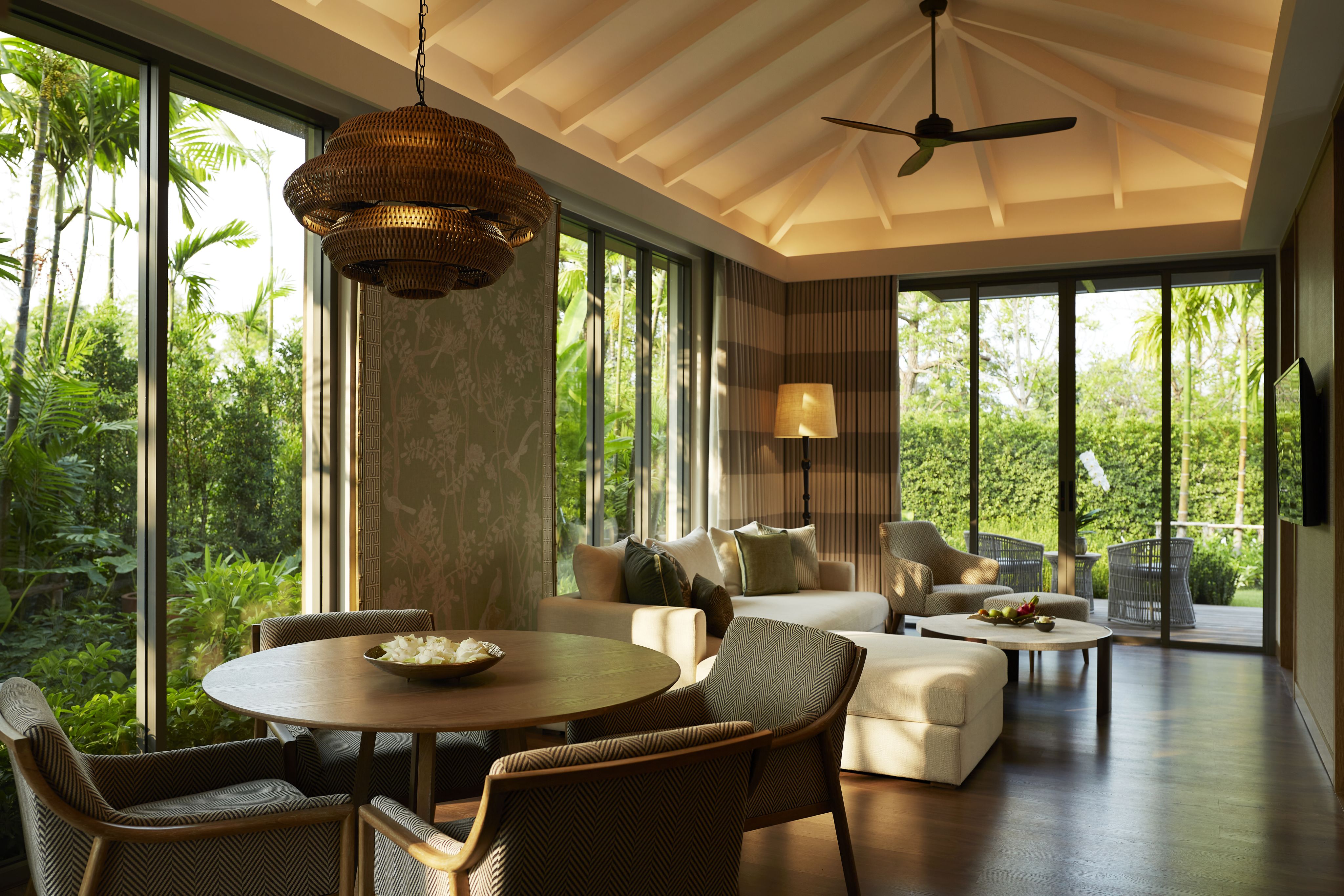 Inside, a 20-metre-long banquette seat wraps around a sunken circular living room, presenting countless opportunities for lounging. An indoor fire pit with a chimney suspended from the ceiling anchors the space, which looks out over the pool deck, barbecue area, manicured lawns and tree-lined perimeter. Glass walls also offer views of the surrounding mountains. A spacious kitchen features light-wood cabinetry and a central, marble-covered, circular island that is topped with cooking hobs.