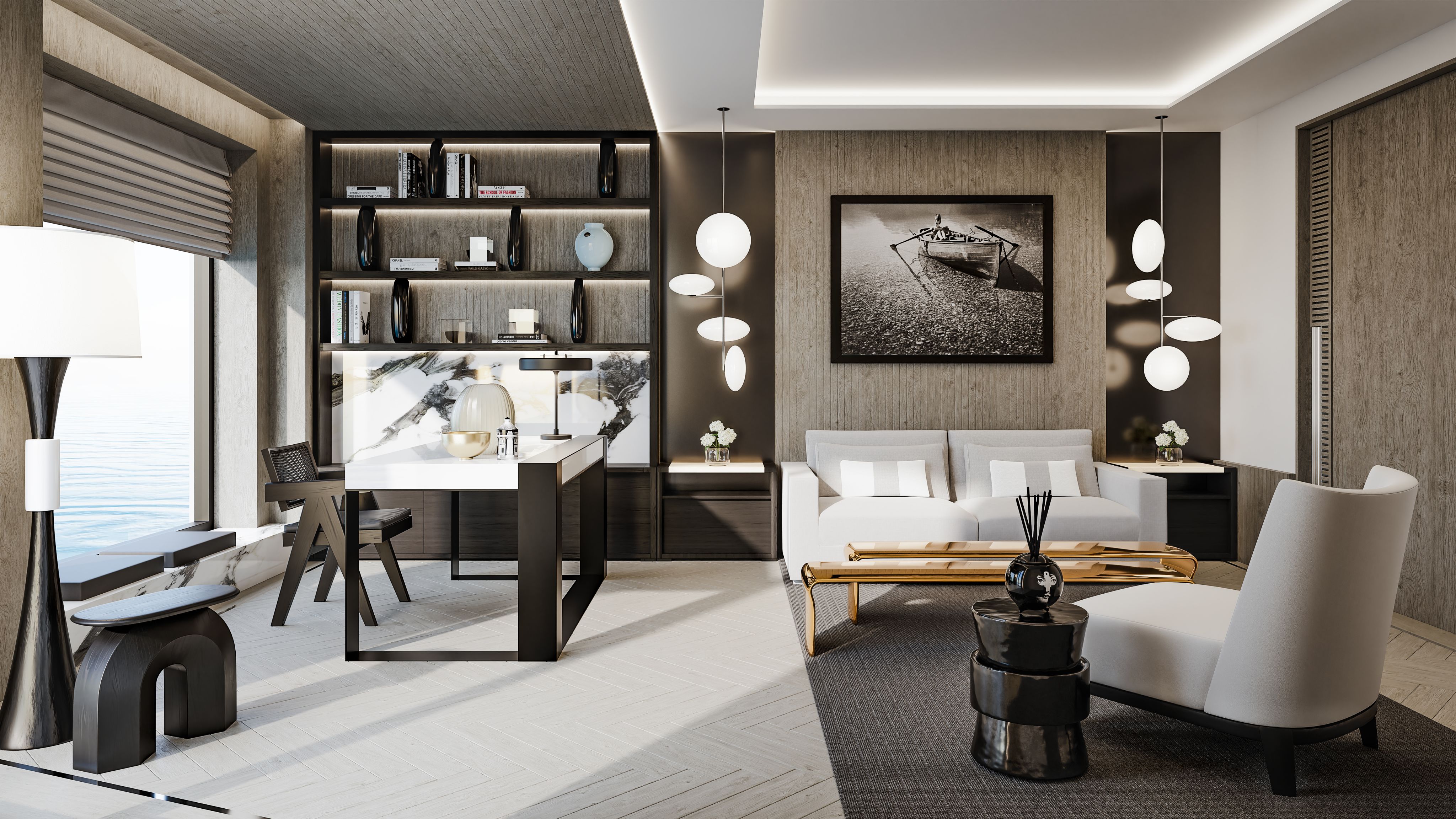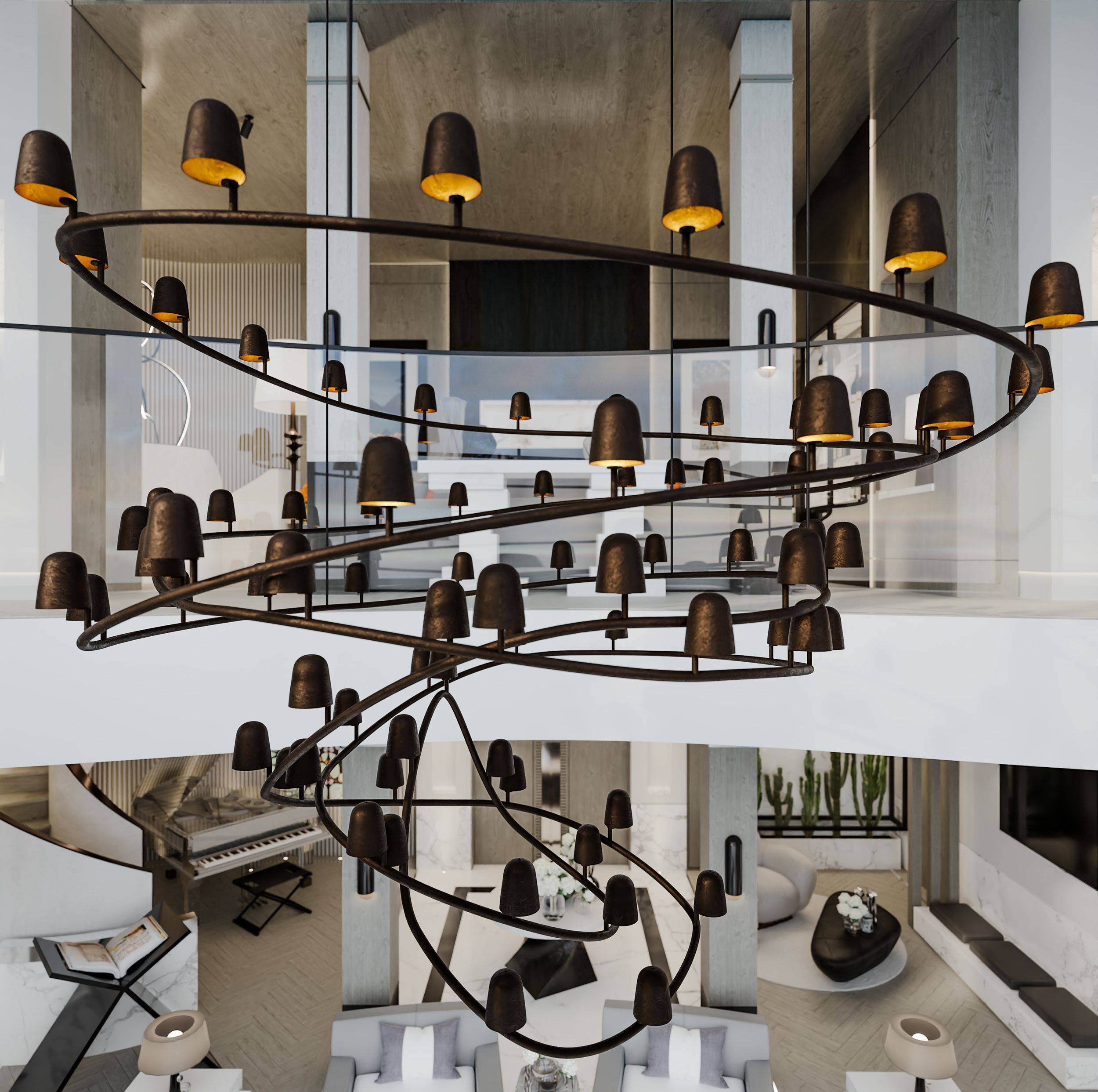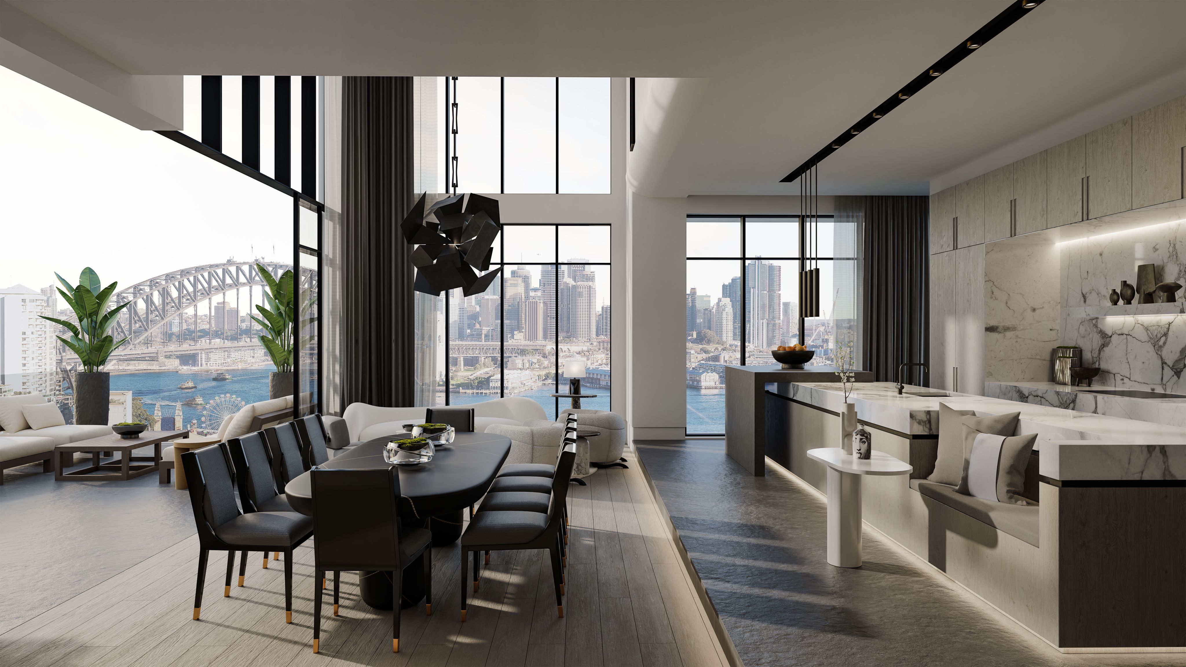 “The architecture is extraordinary in itself. It’s very much that ‘inside-out’ living, but because of the scale of it, the challenge was to make it warm and inviting and liveable, and that’s something we do well here, because we love the scale but also we love the intimacy. So it was all about the lighting and the levels and creating texture with marble and stone and wood.”