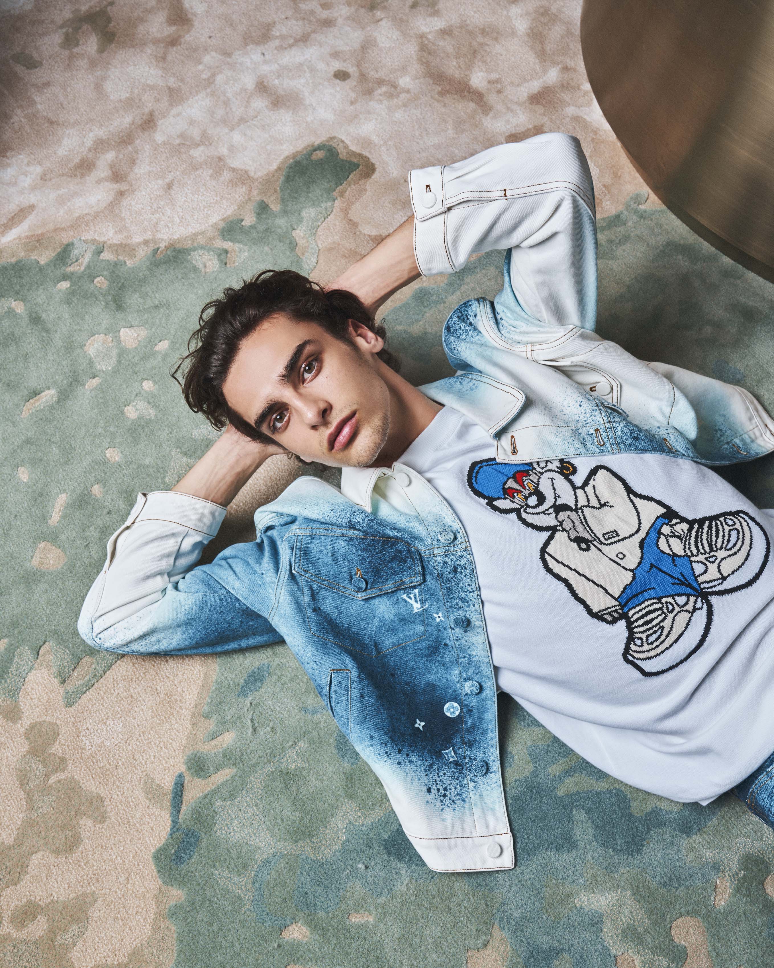 Knitted top, Dh2,886; denim jacket, Dh6,210; and jeans, Dh3,251, all from Louis Vuitton