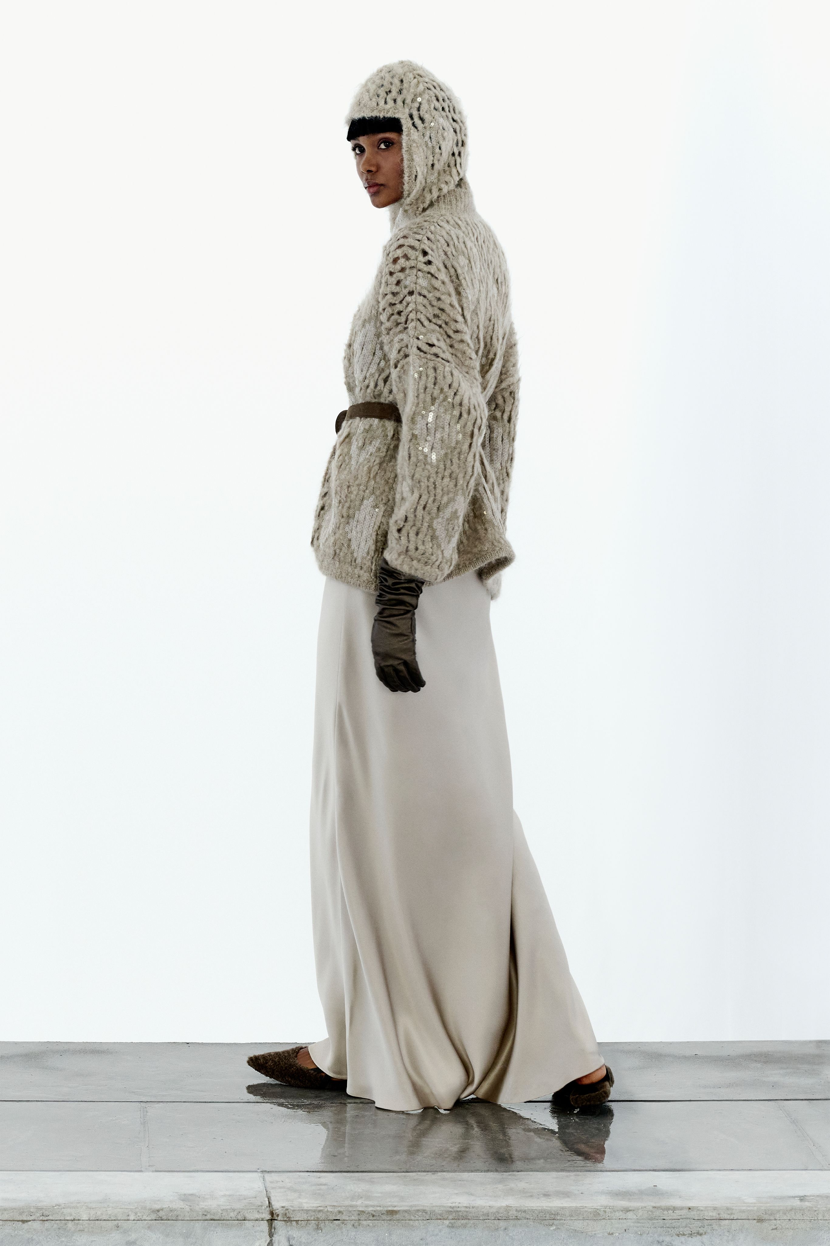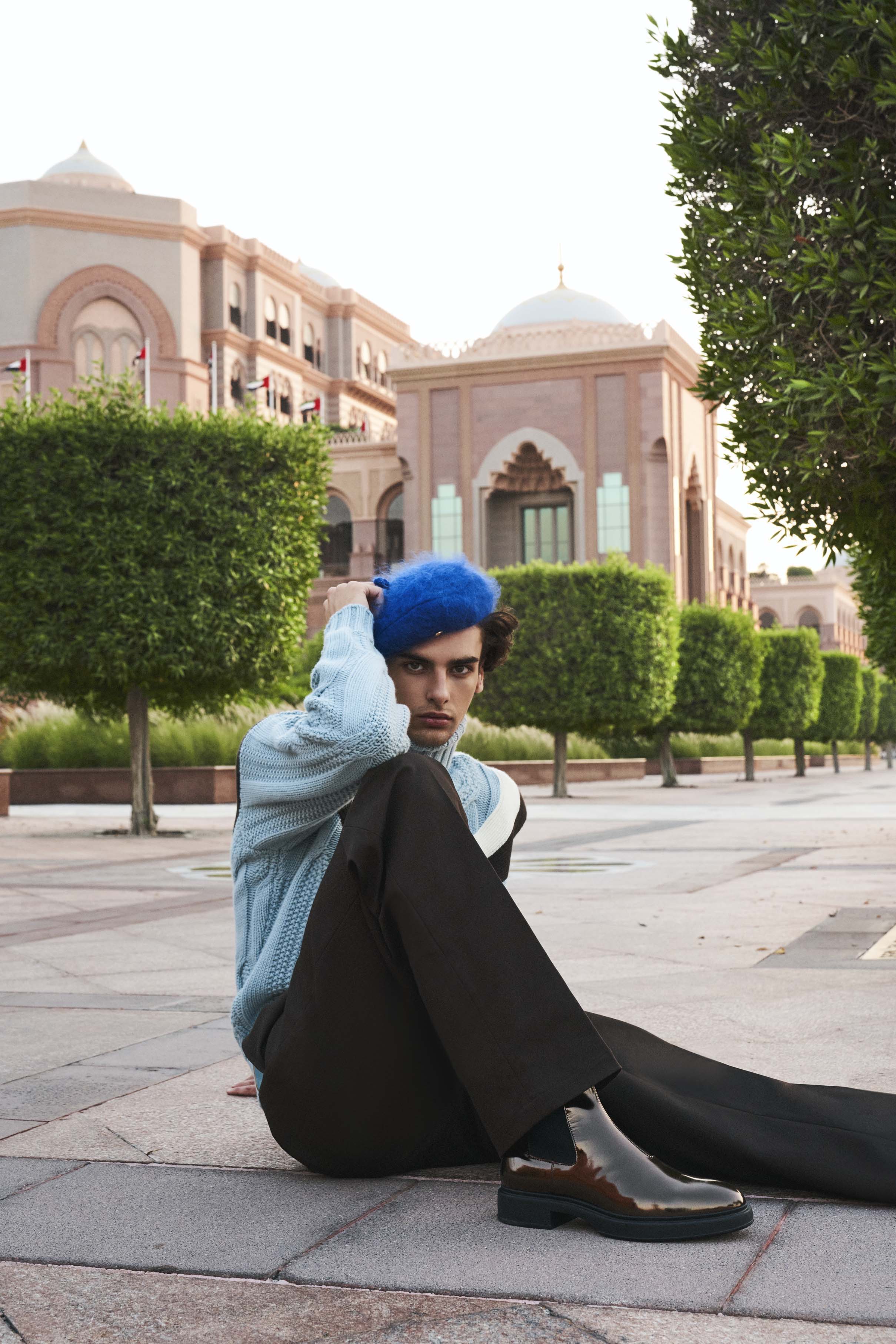 Jumper, Dh8,538; trousers, Dh6,243; and boots, Dh4,836, all from Hermès. Beret, Dh1,800, Gucci