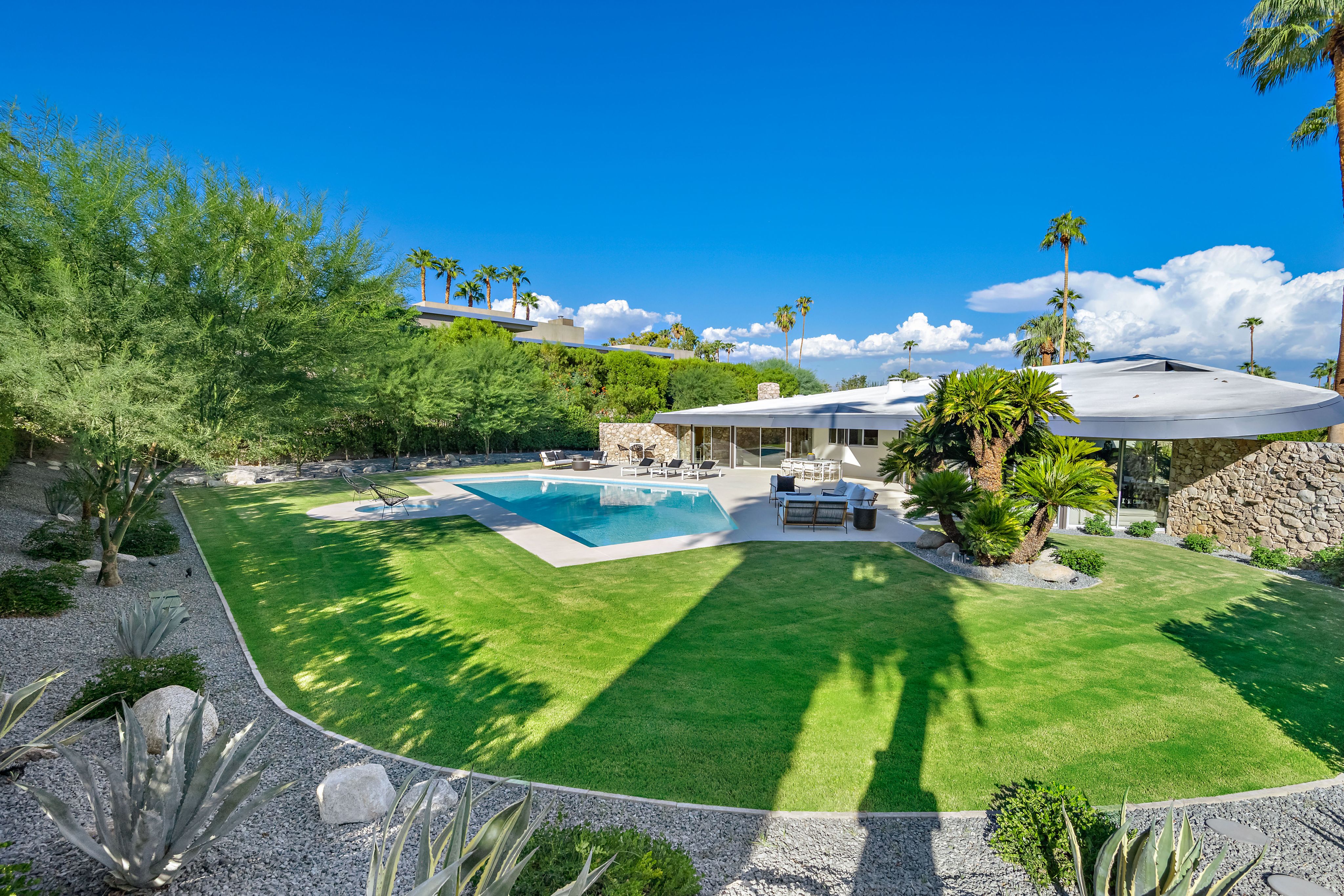 The home has recently been renovated and the public was given a first chance to explore its renewed lustre during last month’s Modernism Week. An important example of mid-century modern design, it was completed in 1960, immediately capturing attention with its curvilinear form and futuristic-looking features. An indoor kitchen grill and wall-mounted radios also set it apart.