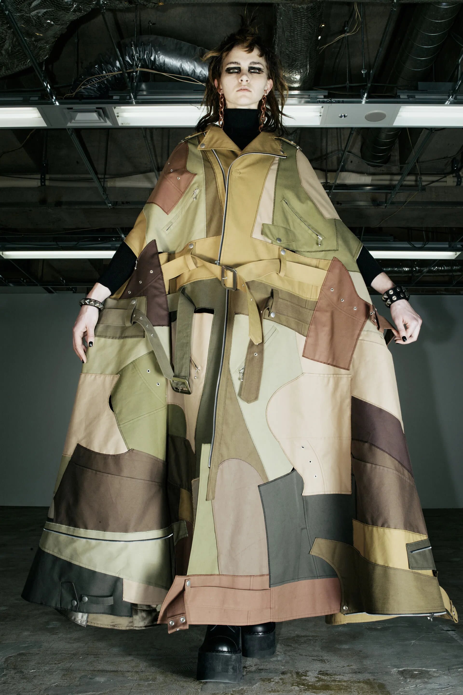 Recycled from discarded jackets that have been patchworked into an oversized coat, this creation is at once original and practical.
