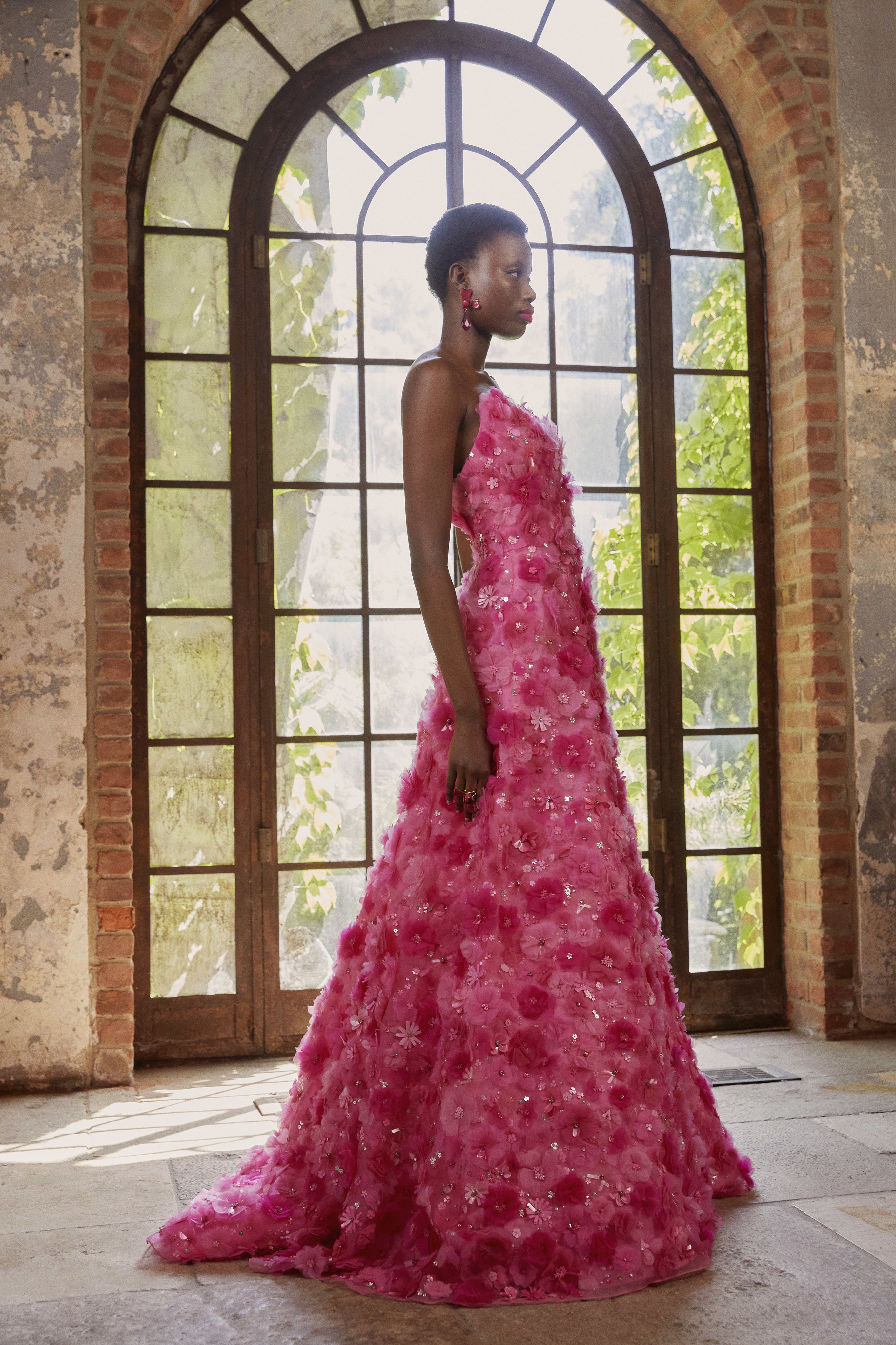 Elsewhere, there is a dramatic cropped puffed dress with a back that Gordon calls a “brush stroke of perfect red faille”, while a 1980s drop-waist cocktail dress in pink and red not only captures his favourite colour combination, but also the spirit of the Herrera woman. “She is unforgettable. I always say the Herrera woman is the one on the sidewalk in hot pink, red or yellow, when everyone else is wearing beige.”