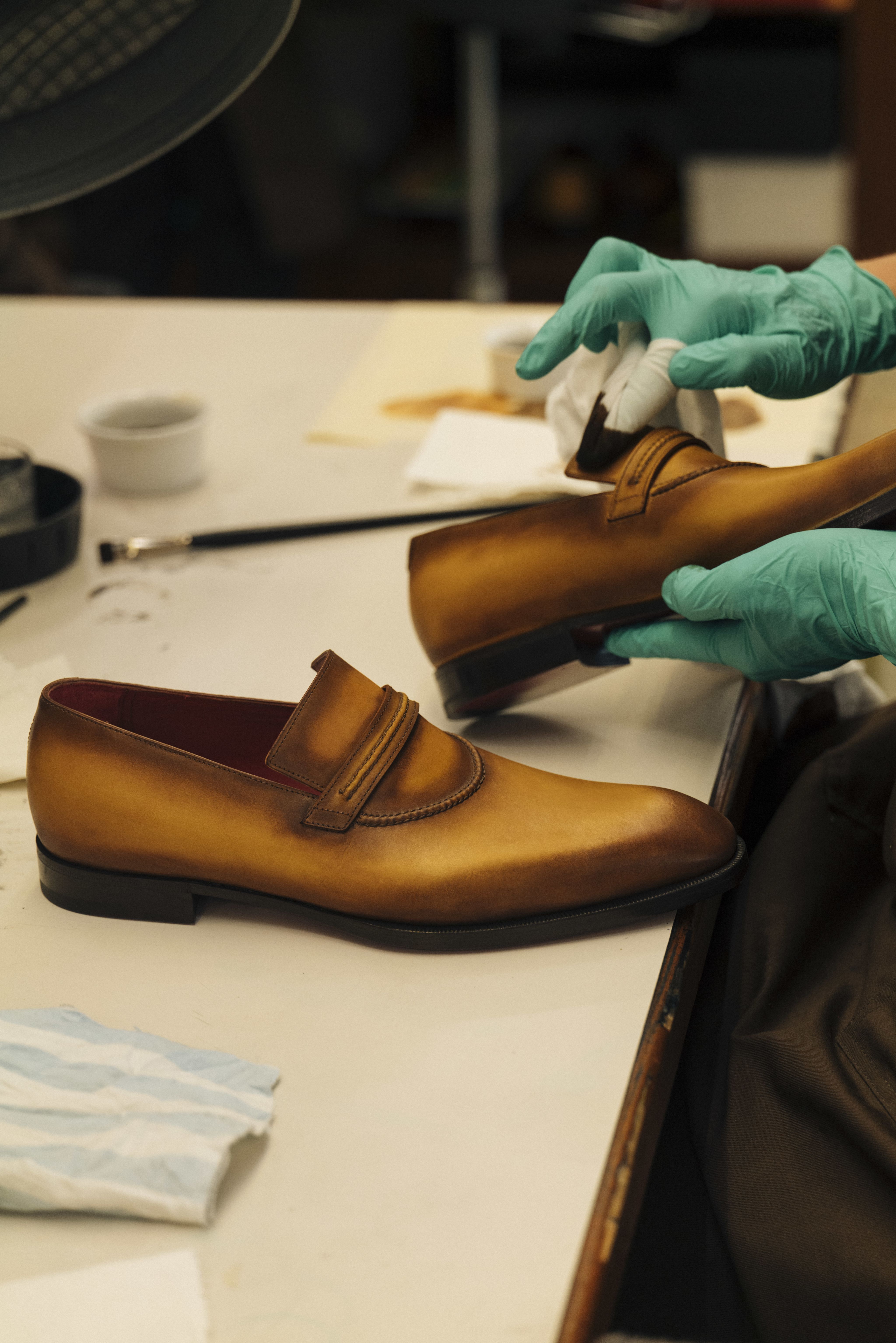 Watching the respect that goes into every step of the process, from handling the smallest piece of leather to hand-painting every stroke, to the artistry of tattooing leather and creating custom patinas, it’s clear how the brand gained its reputation as one of the world’s top men’s shoemakers.