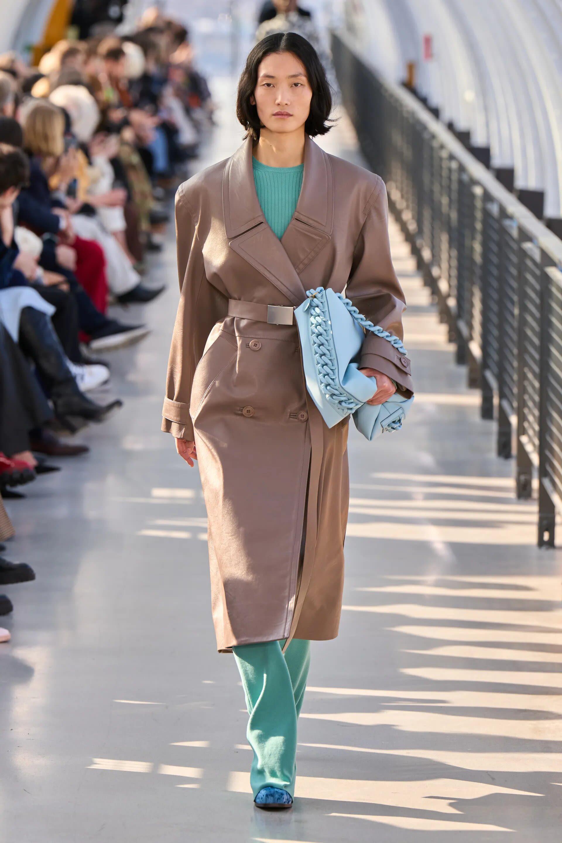 At Alexander McQueen, a deconstructed trench is cut from repurposed polyfaille, with an asymmetric hemline.