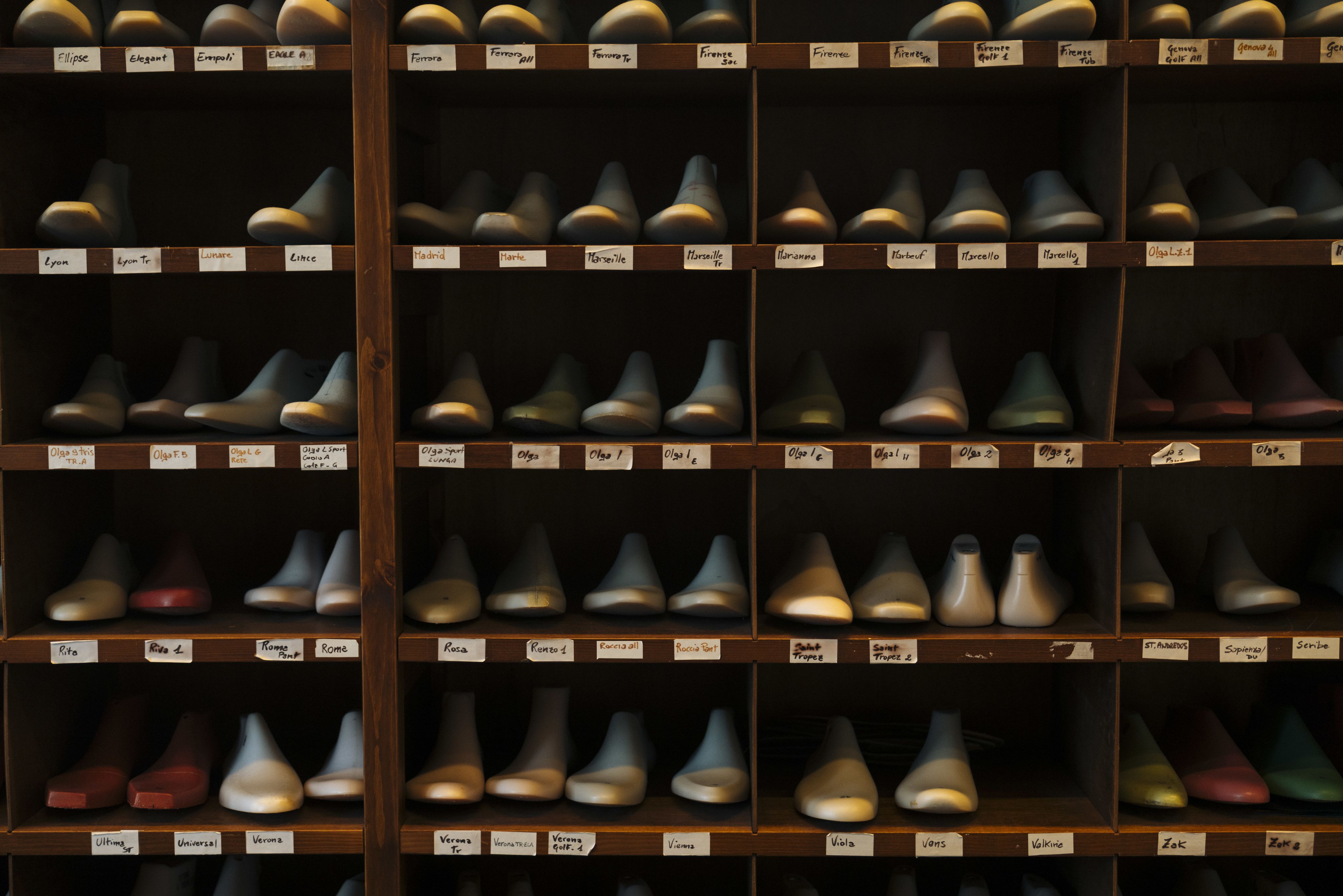 Rows of lasts made from hornbeam on display in the Manifattura Berluti