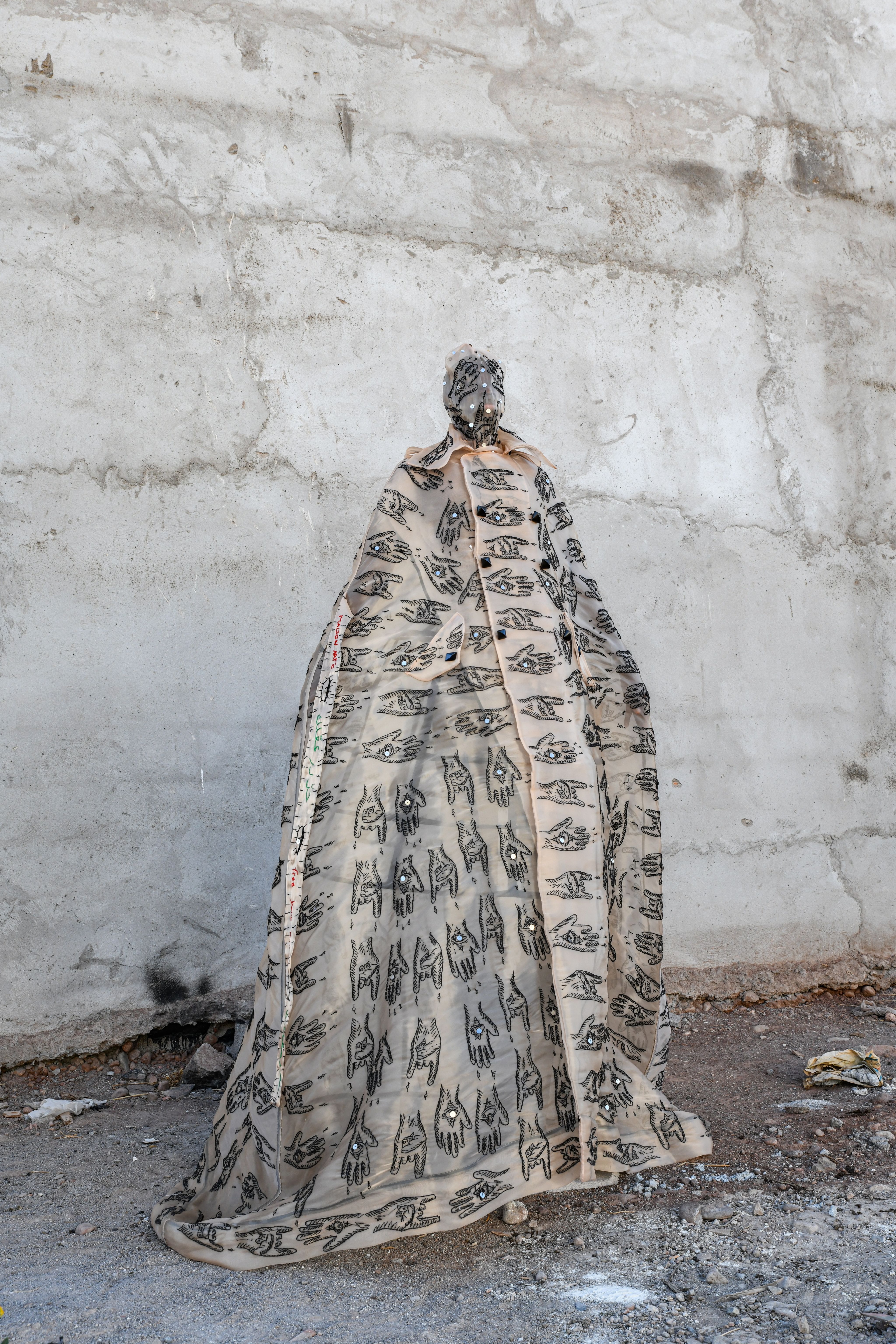 Highlights of the exhibition include garments by Iamisigo from Kenya, South Africa’s Magugu, couturier Ayissi, and a striking design from Morocco’s Maison ARTC that is a contemporary take on the fully enveloping burqa – sand-coloured and covered with talismanic hands to ward off the evil eye.
