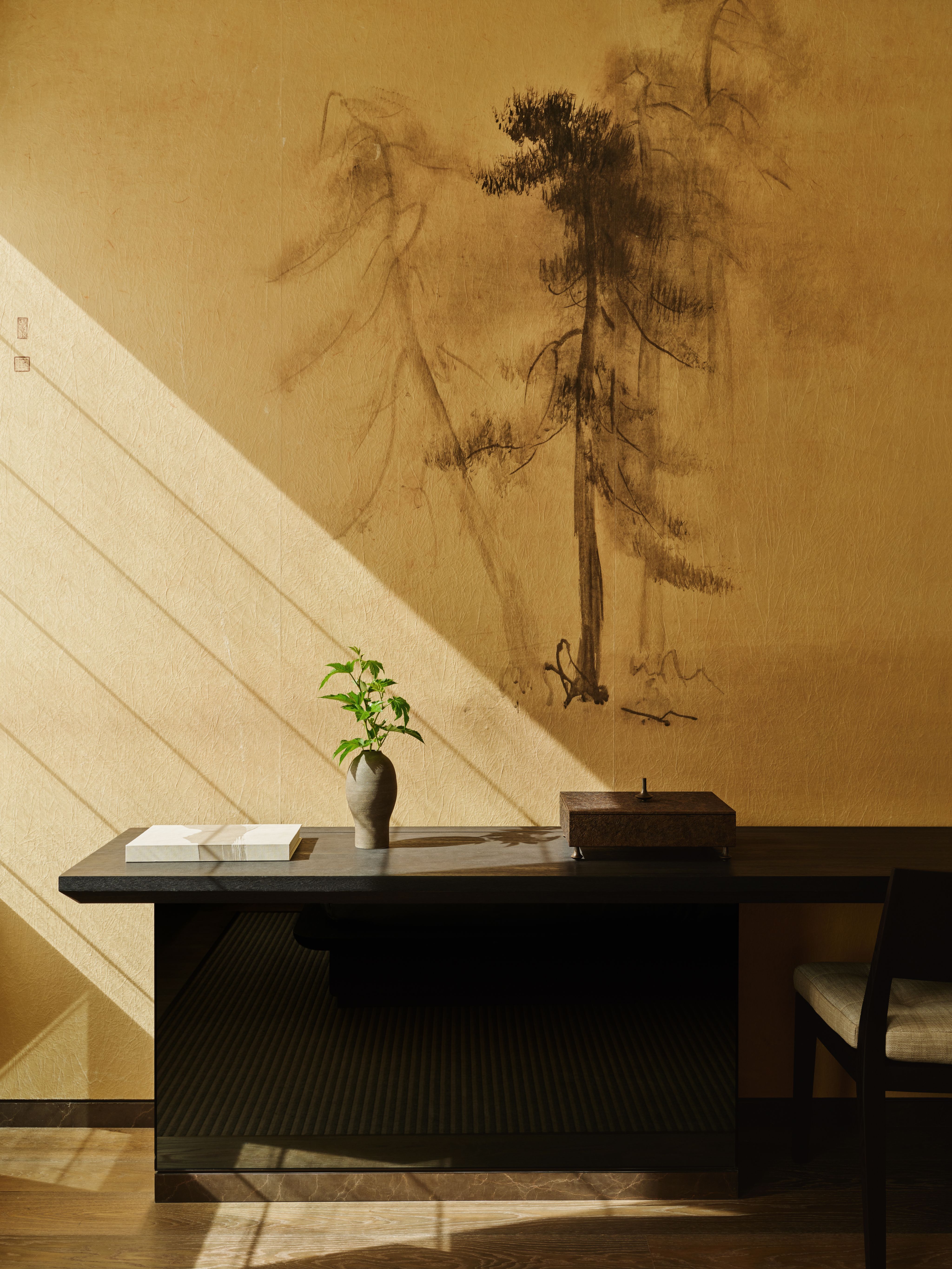 Each of the suites also features a wall-length art mural inspired by the 15th-century masterpiece Pine Trees (Shorin-zu byobu) by Japanese artist Hasegawa Tohaku, which can be artfully illuminated with the touch of a button.