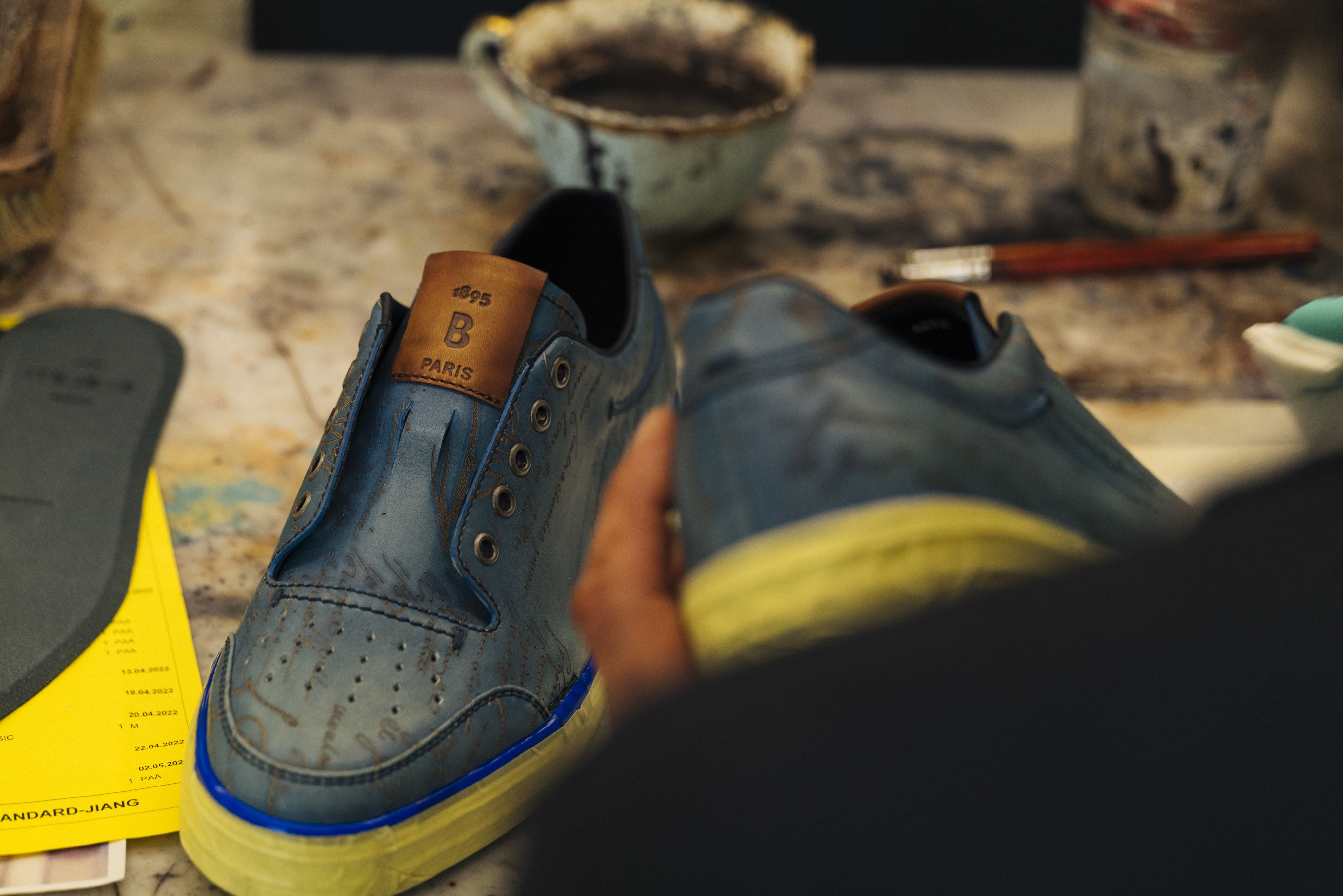 Much of the work happening inside the manifattura is centered around the launch of the brand’s newest and most ambitious sneaker style to date, the Playoff, which features more than 80 individual pieces of leather – each of which requires its own process. The start of this procedure, as with all Berluti shoes, is a 2D hand-drawn design that is traced and placed over the last, before the pattern is scanned digitally.