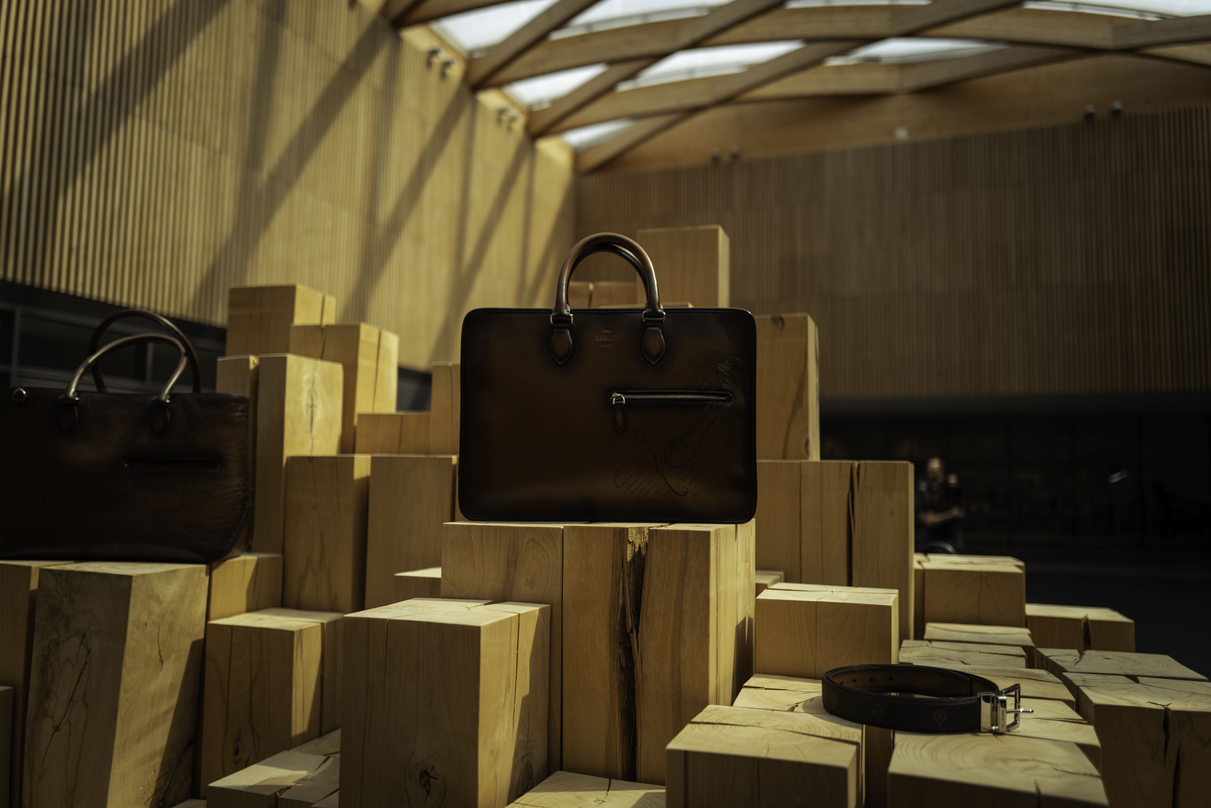 Cedarwood beams, designed to age like Berluti's signature patinas, let light into an airy atrium at the centre of Manifattura Berluti