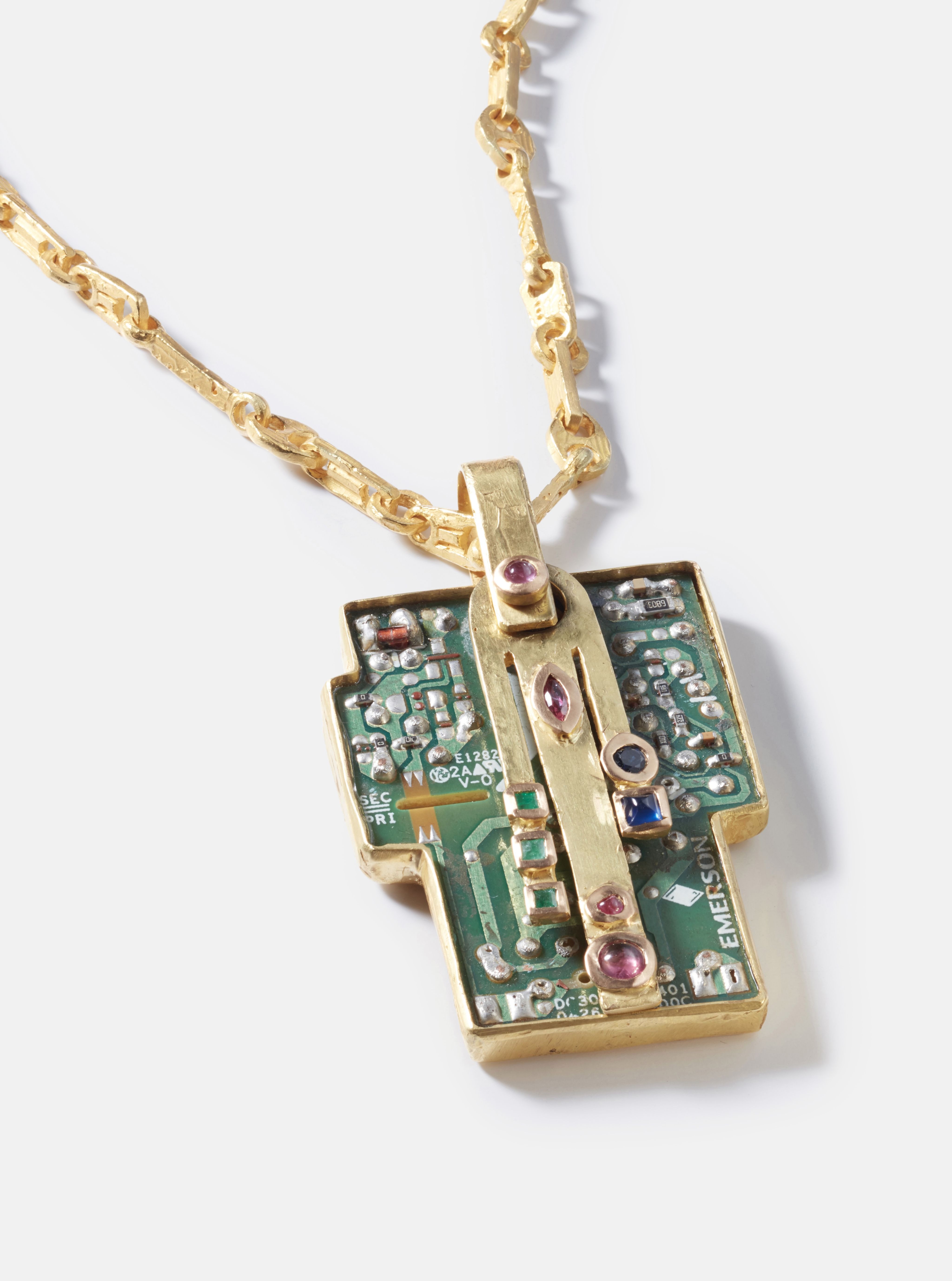 Another British brand, Oushaba, which takes its name from the Arabic word for alloy, is not only sourcing metal from e-waste, but incorporating it into its designs, with pendants made from old USB sticks or bracelets made from old phone charging cables.