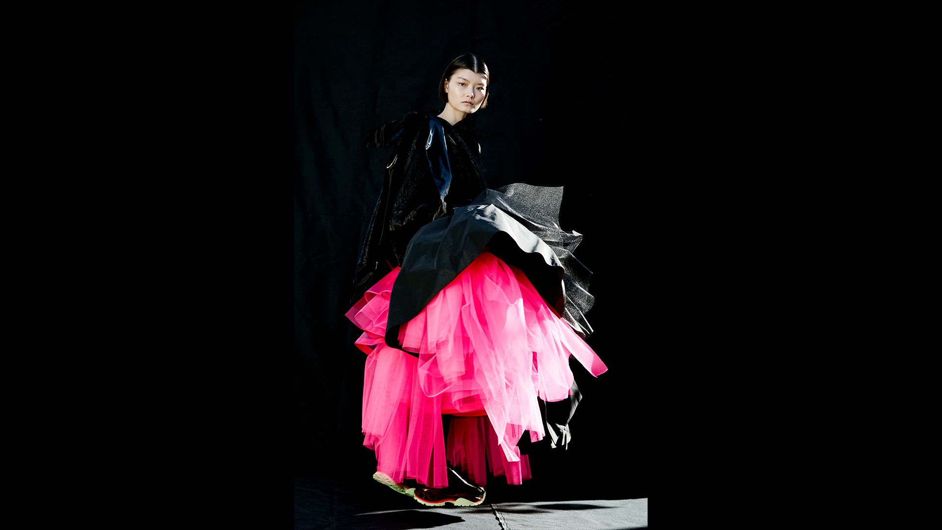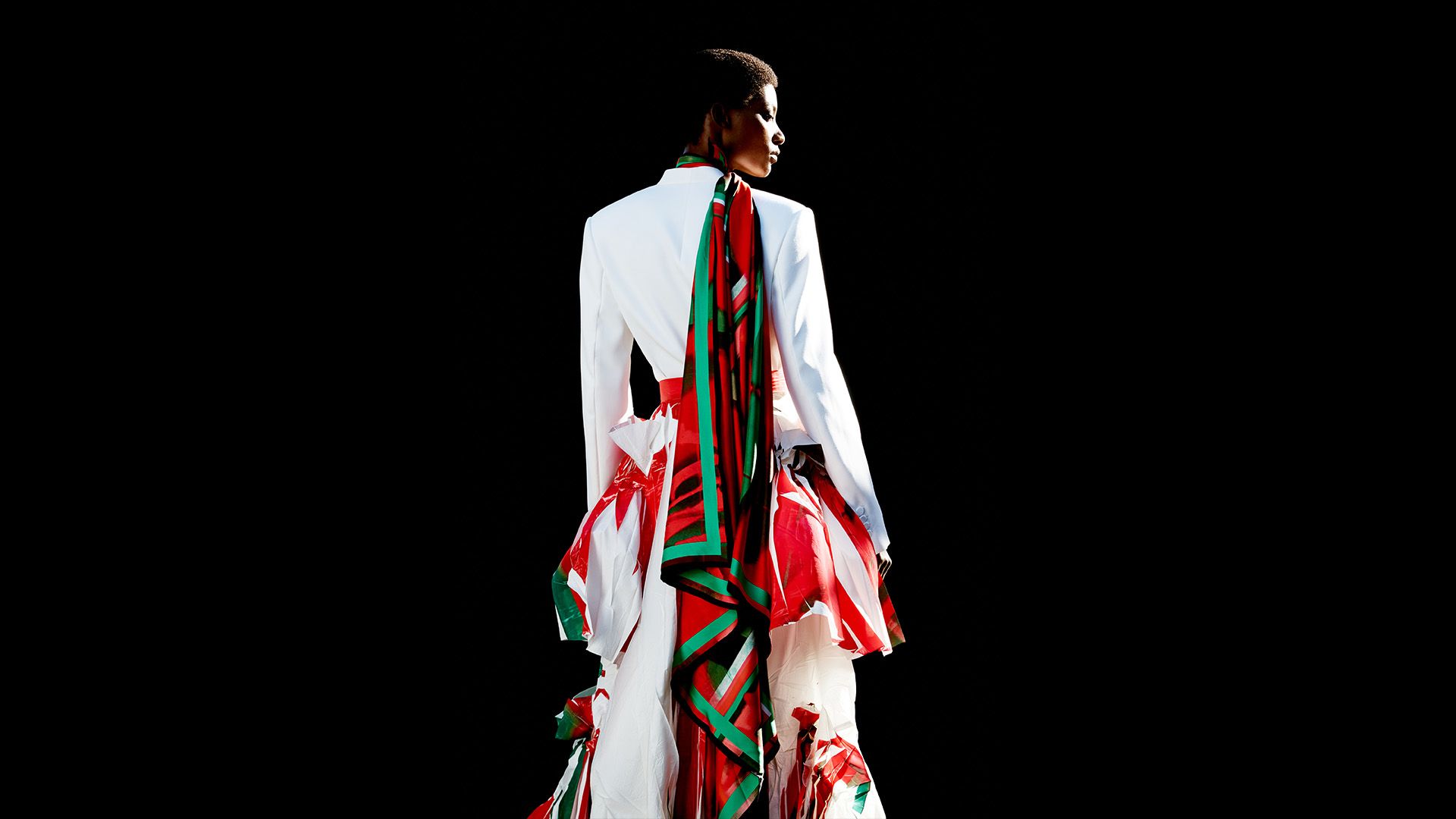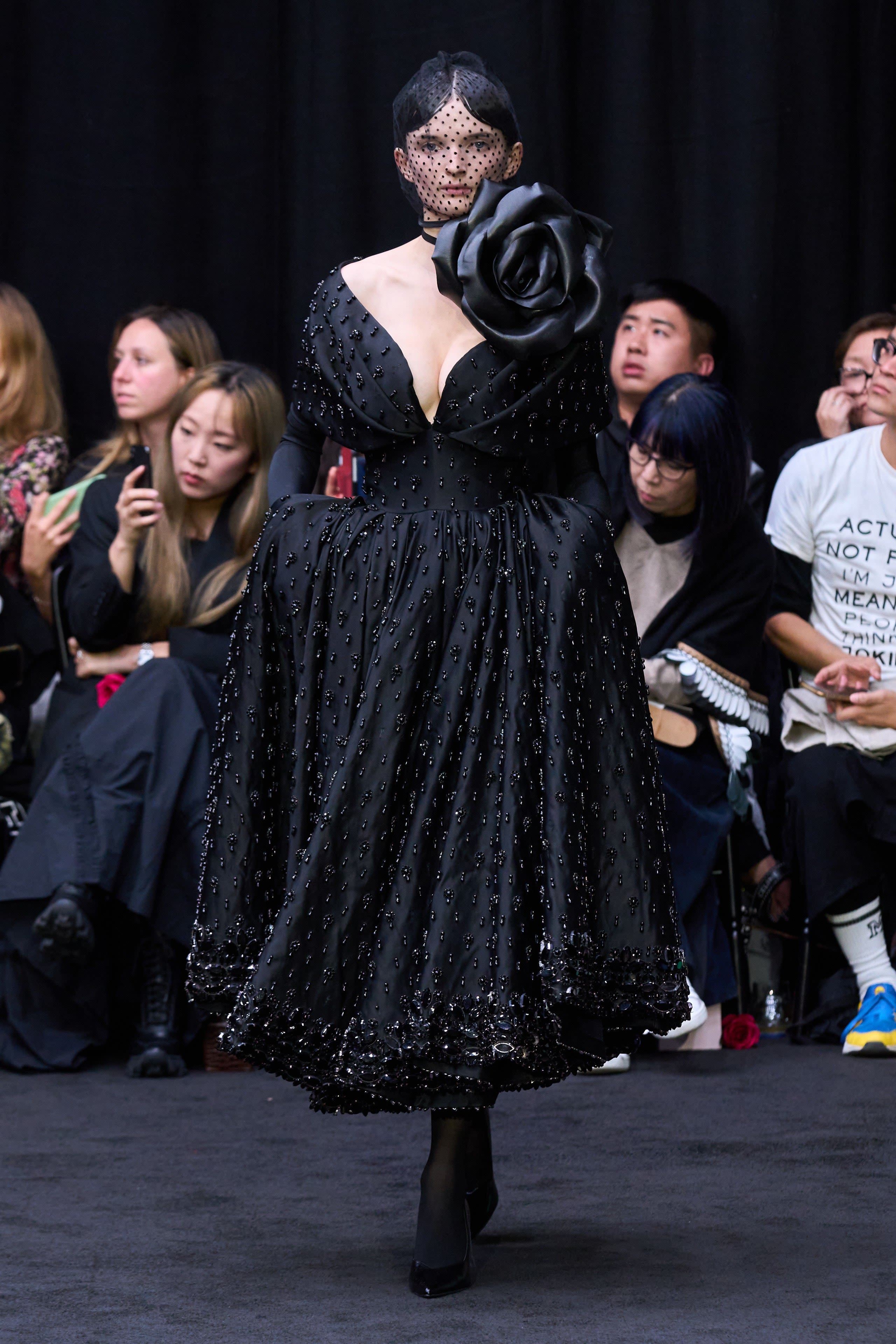 Oversized hips are everywhere this season and at Richard Quinn, come with a vampy edge, courtesy of a veil, huge corsage and jet beading.