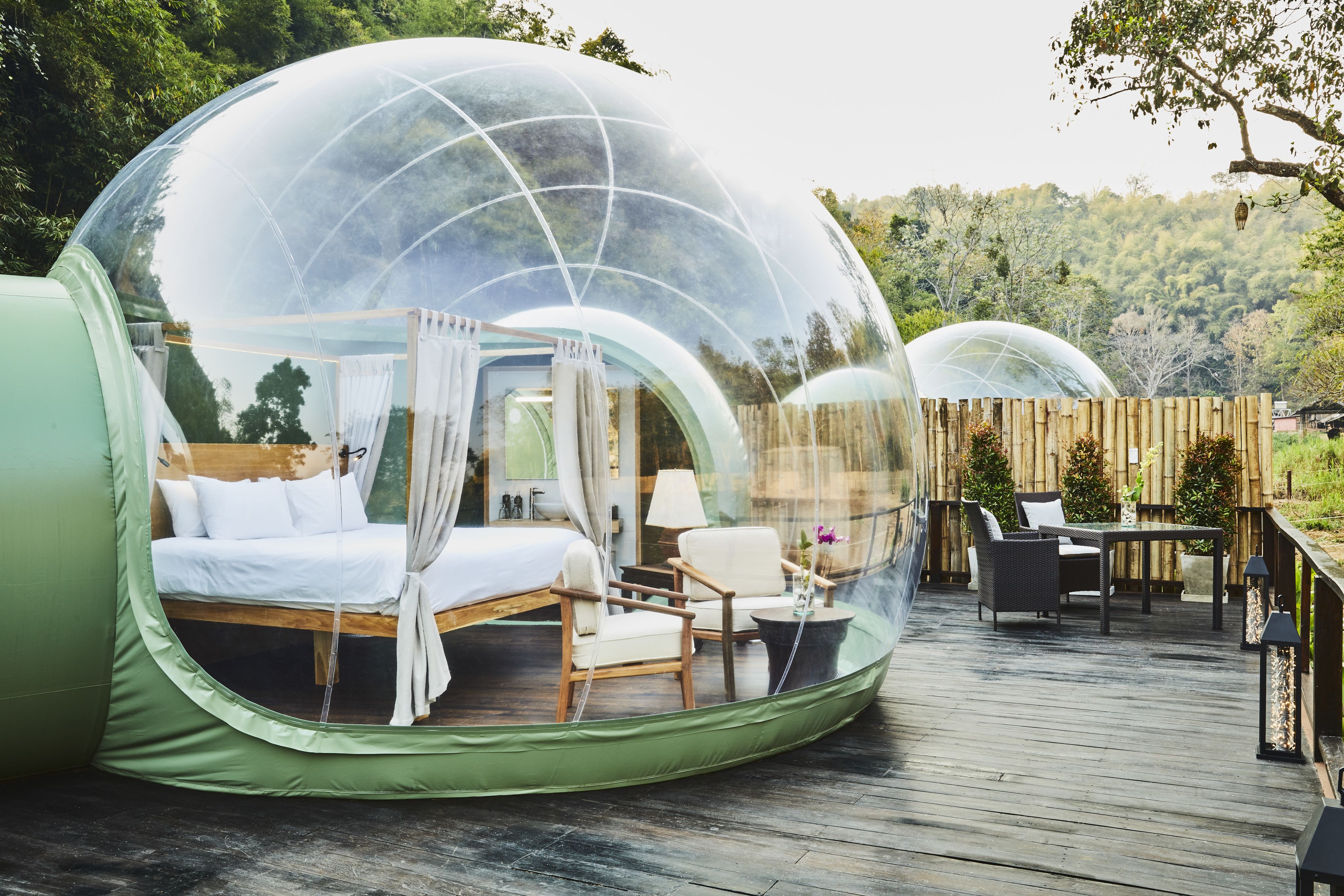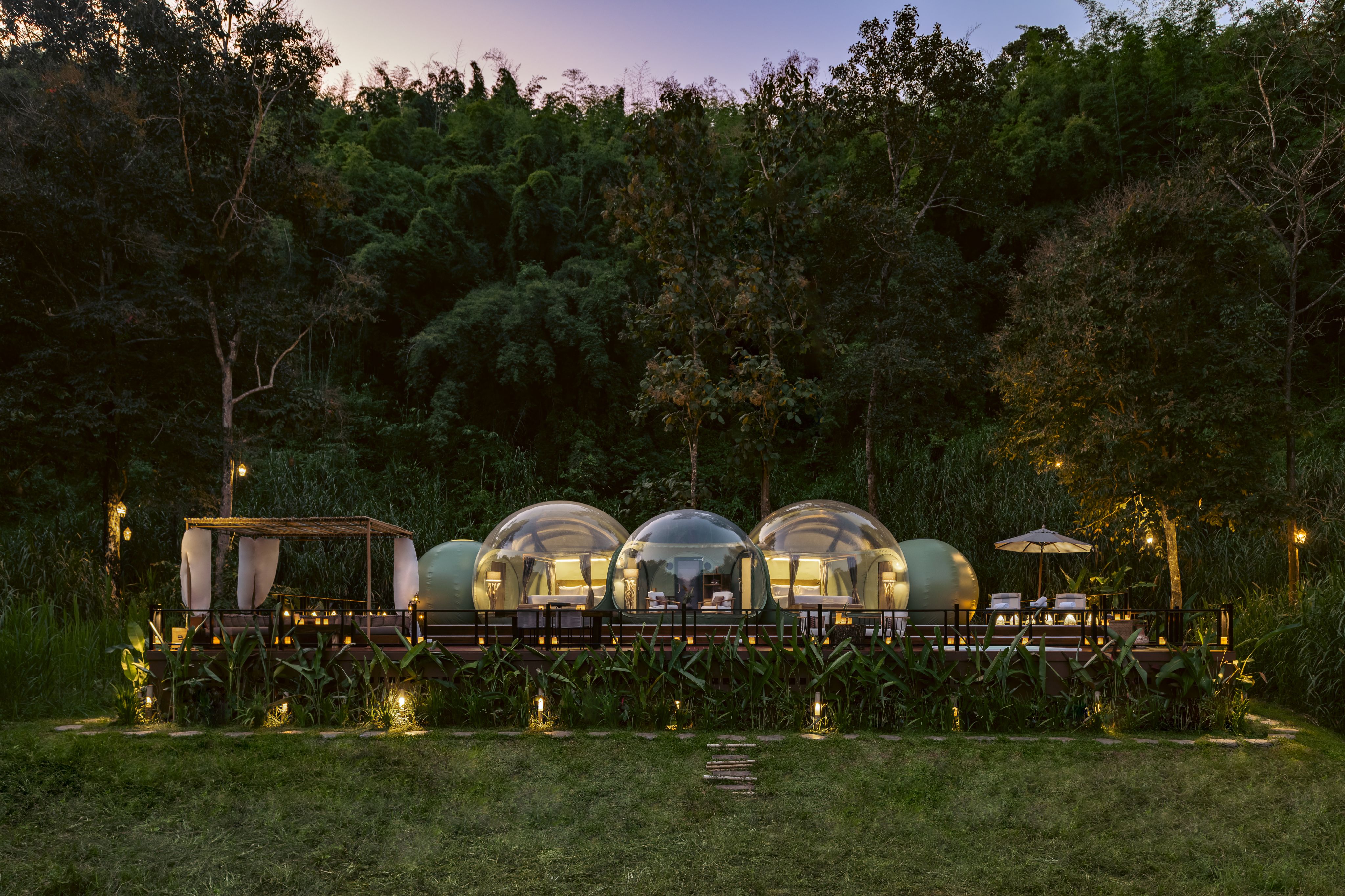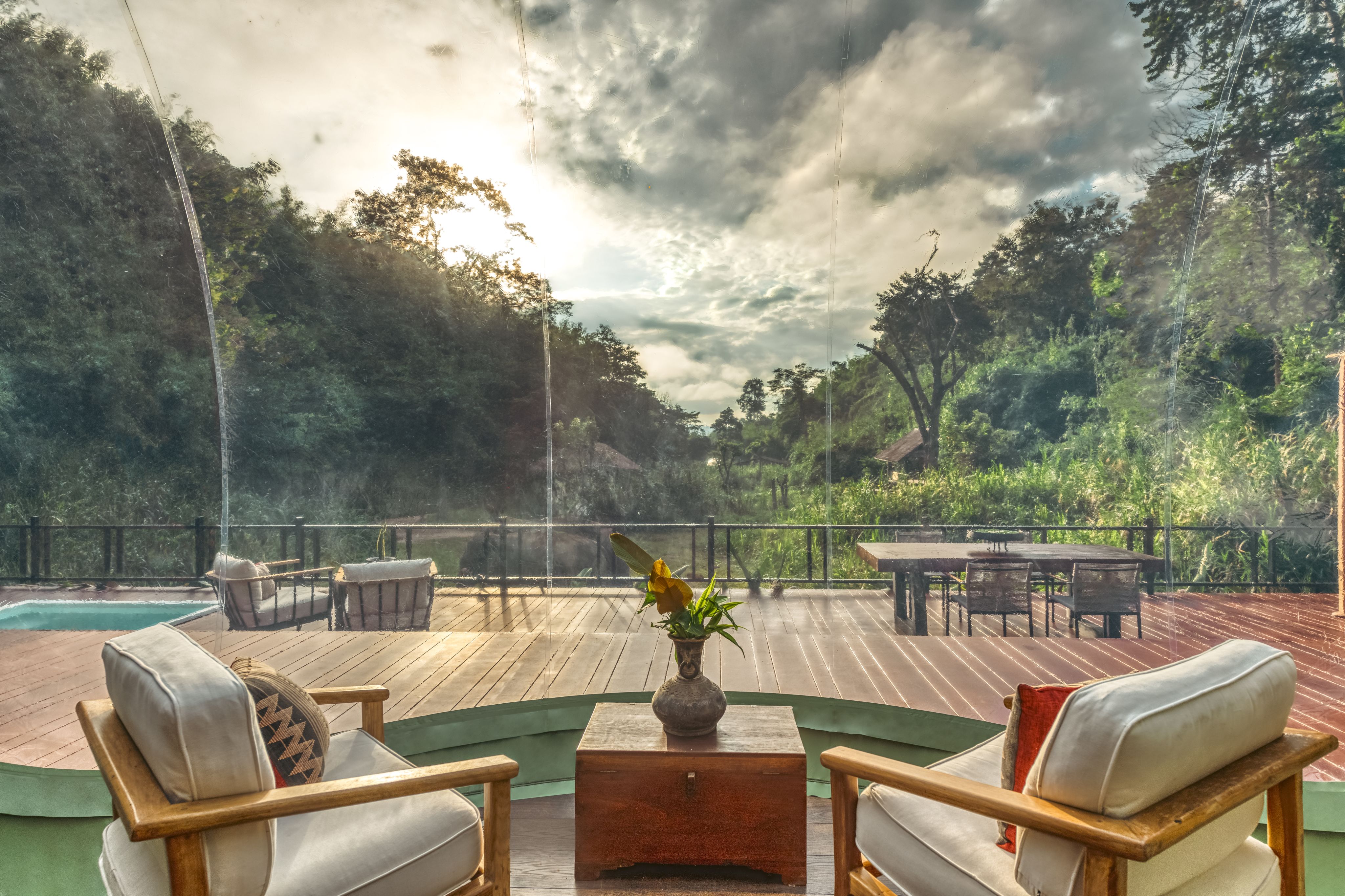 The two Asian elephants are my only companions as I bed down in a jungle bubble at Anantara Golden Triangle Elephant Camp and Resort in northern Thailand. On a raised wooden platform encircled by dense jungle, Anantara has set up four transparent, interconnected spherical structures, crafted from a high-tech polyester.