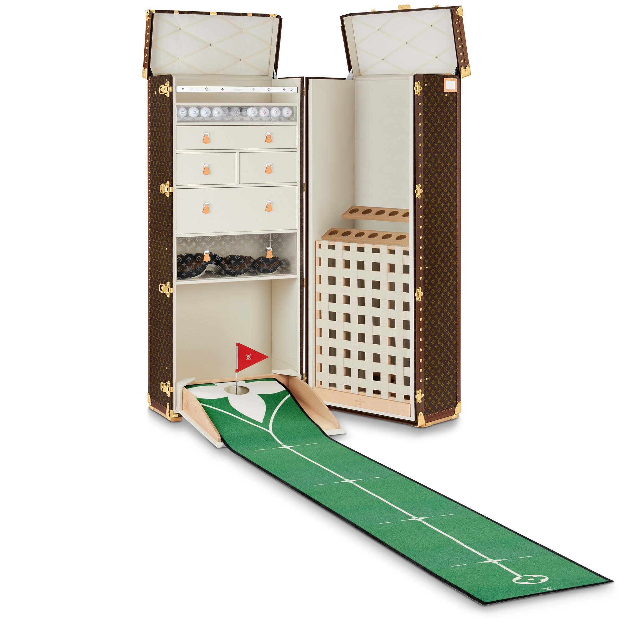 To one side, there are 14 slots to hold golf clubs; on the other, a selection of drawers, including a dedicated section for 18 golf balls. The putting mat rolls out from the bottom and leads up to a built- in cup, which is also marked with an oversized Monogram flower and topped with a jaunty red flag featuring the LV logo.