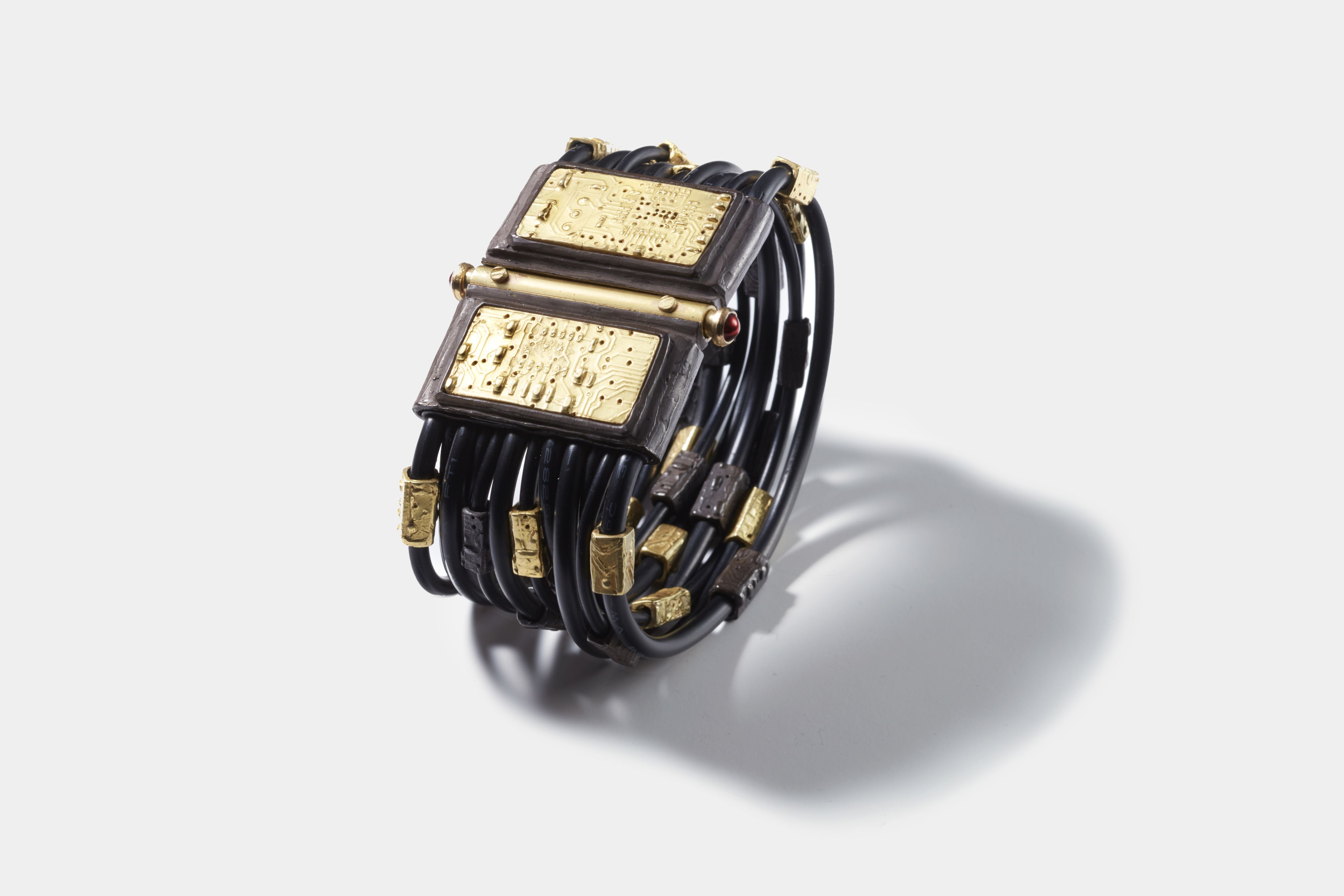A cuff bracelet by Oushaba, made from a gold-plated switch board and old charging wires. Photo: Oushaba