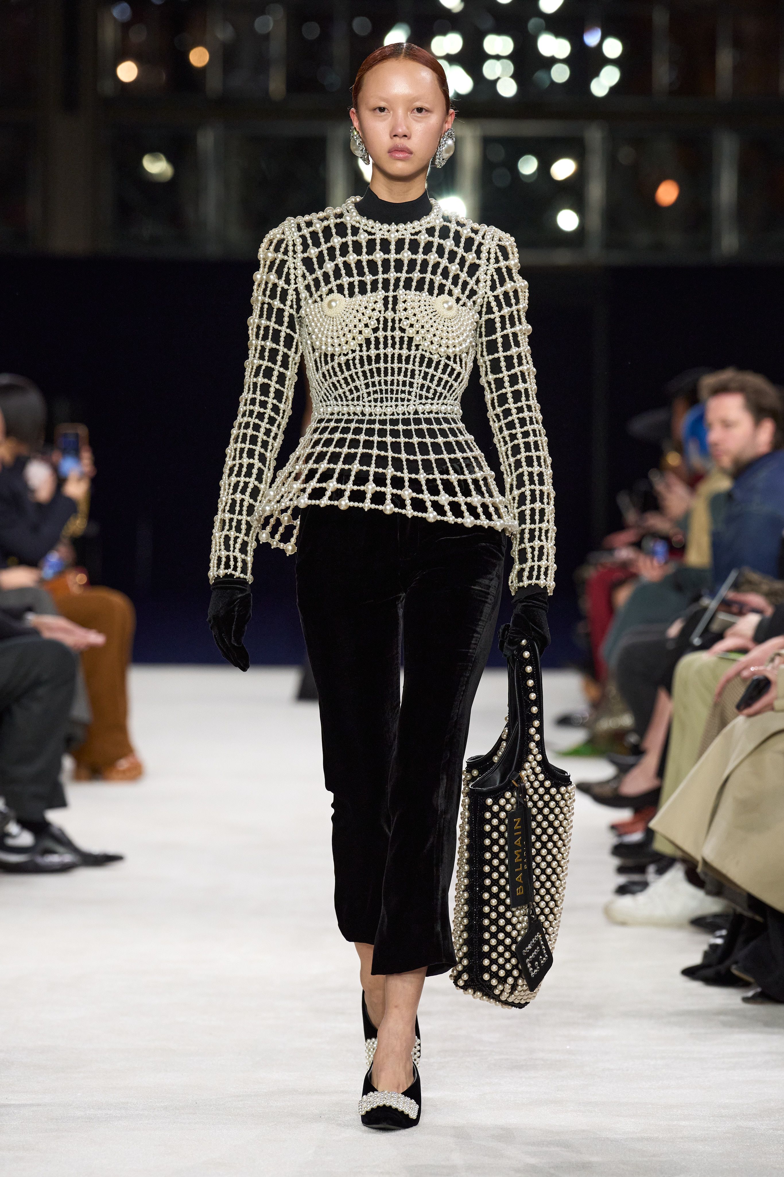 As the house’s current creative director, he paid tribute to Pierre Balmain’s 1945 New French Style collection, particularly the Jolie Madame silhouette, with its strict tailoring, cinched waists and strong shoulders. Monsieur Balmain was a master of pattern and embellishment, each season reprising polka dots and pearls. Especially pearls, as Rousteing mentioned in his show notes: “It’s clear to see that we’ve pushed the limits of one of his favourite luxury details – perfectly embroidered pearl ornaments.”