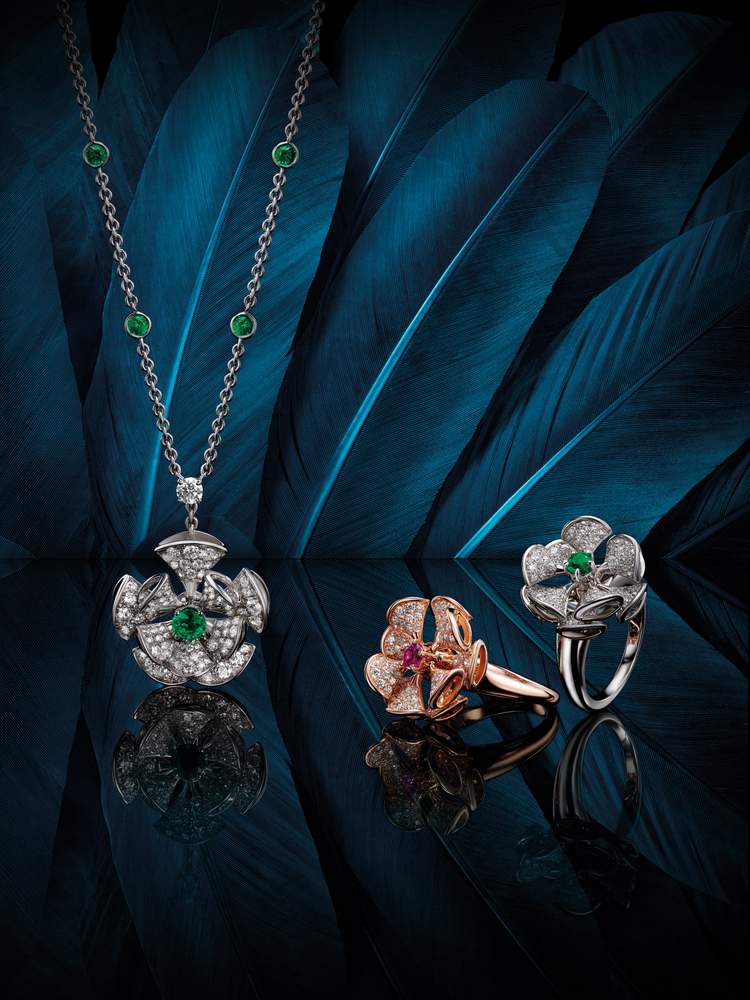 Bulgari Diva’s Dream necklace in white gold with an emerald and pavé diamonds. Bulgari Diva’s Dream ring in pink gold with a pink sapphire and pavé diamonds.