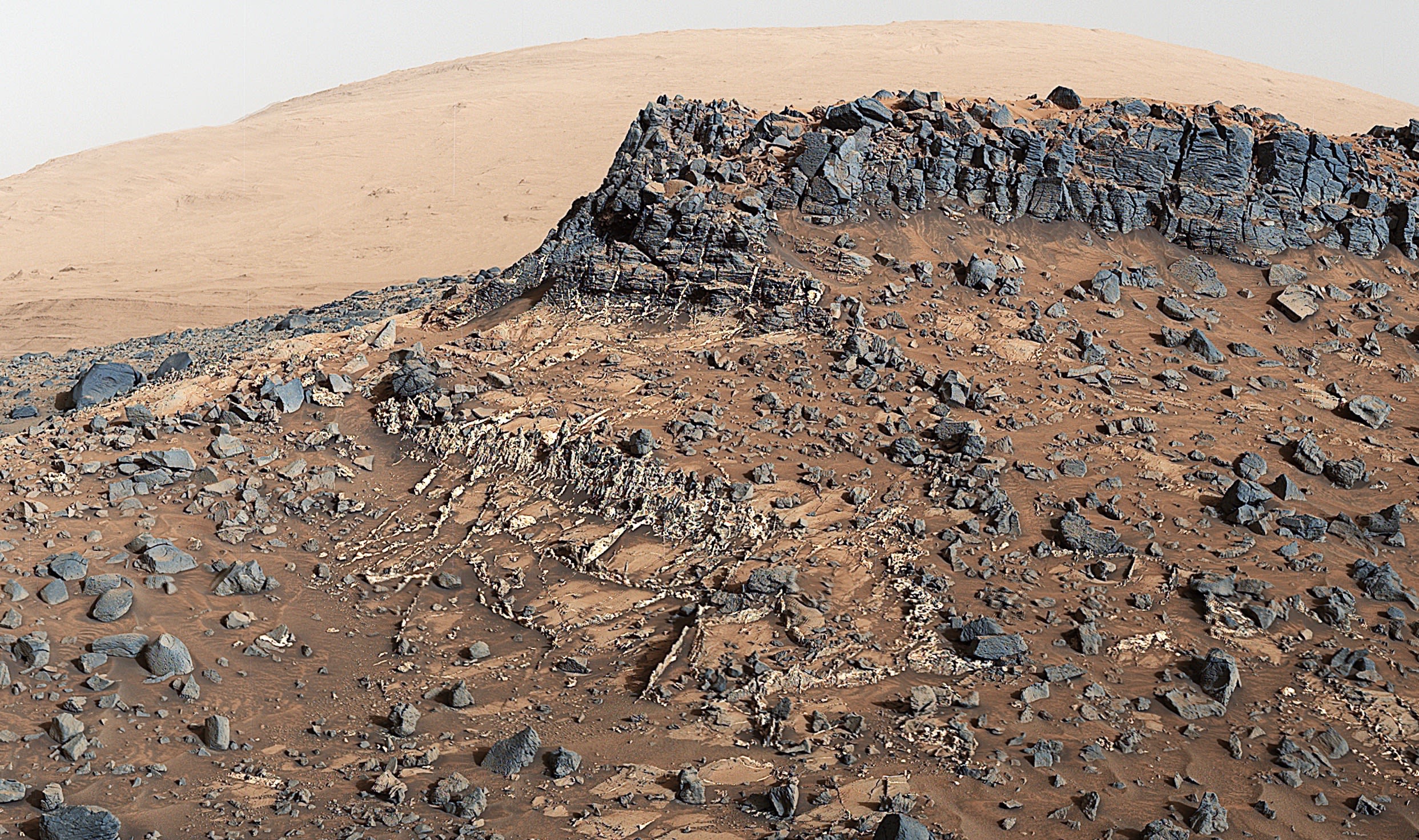 Veins of minerals can be seen in the rocks on the lower slopes of Mount Sharp. The photograph was taken in 2015