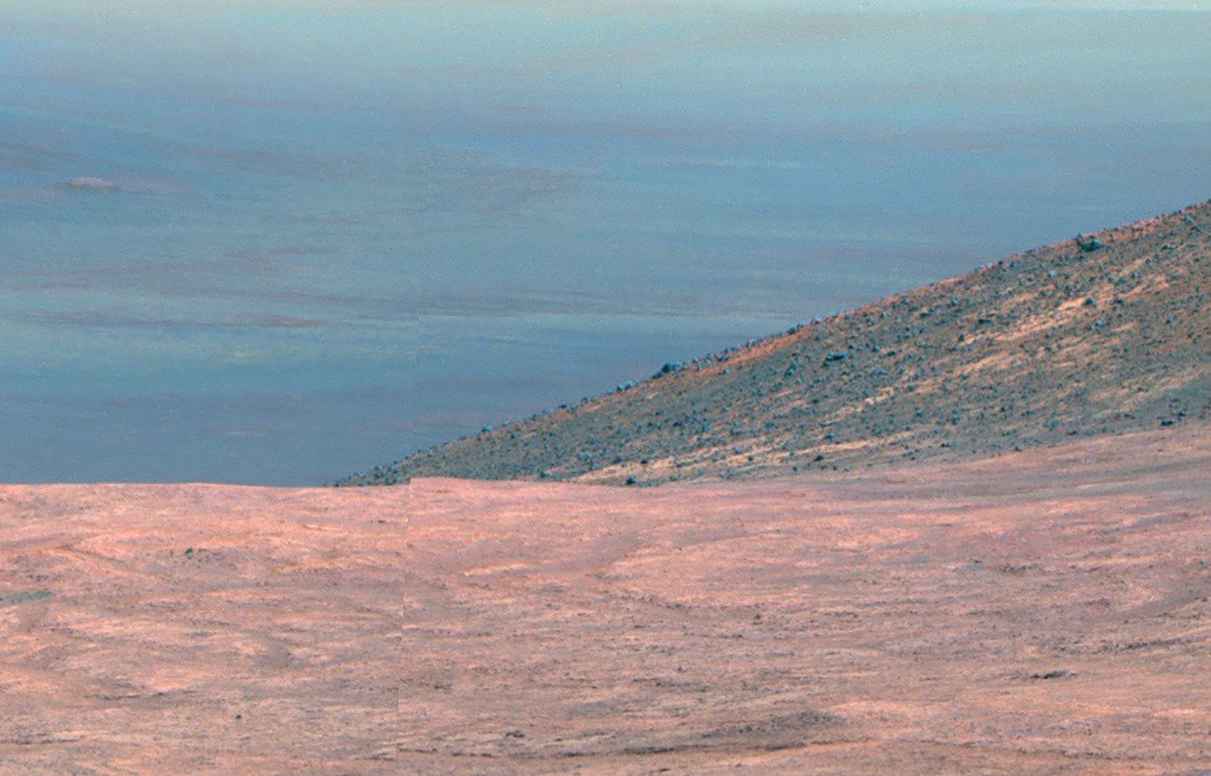 Marathon Valley, taken by the Opportunity Rover in 2015. Opportunity landed in 2004 and is still going strong. We are cheating a bit here. Nasa has used false colours to make the differences in surface materials easier to see.