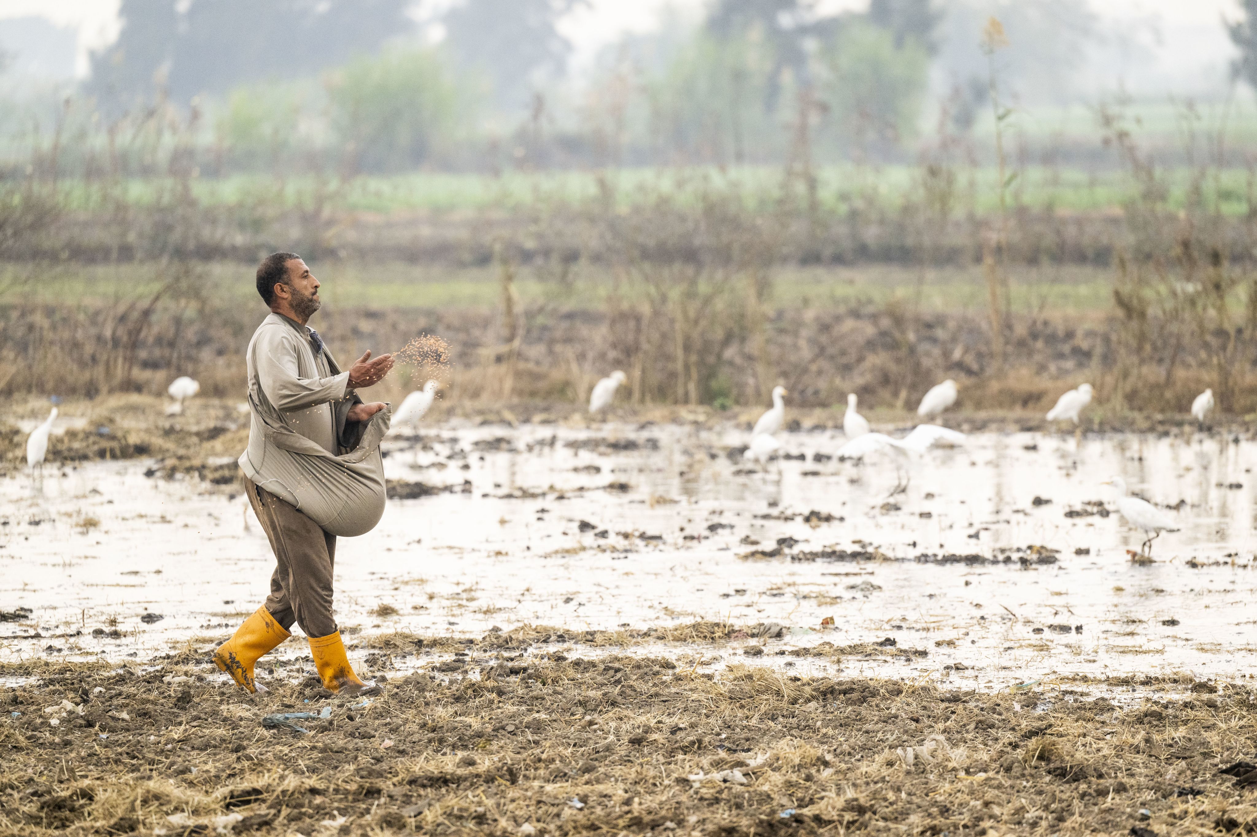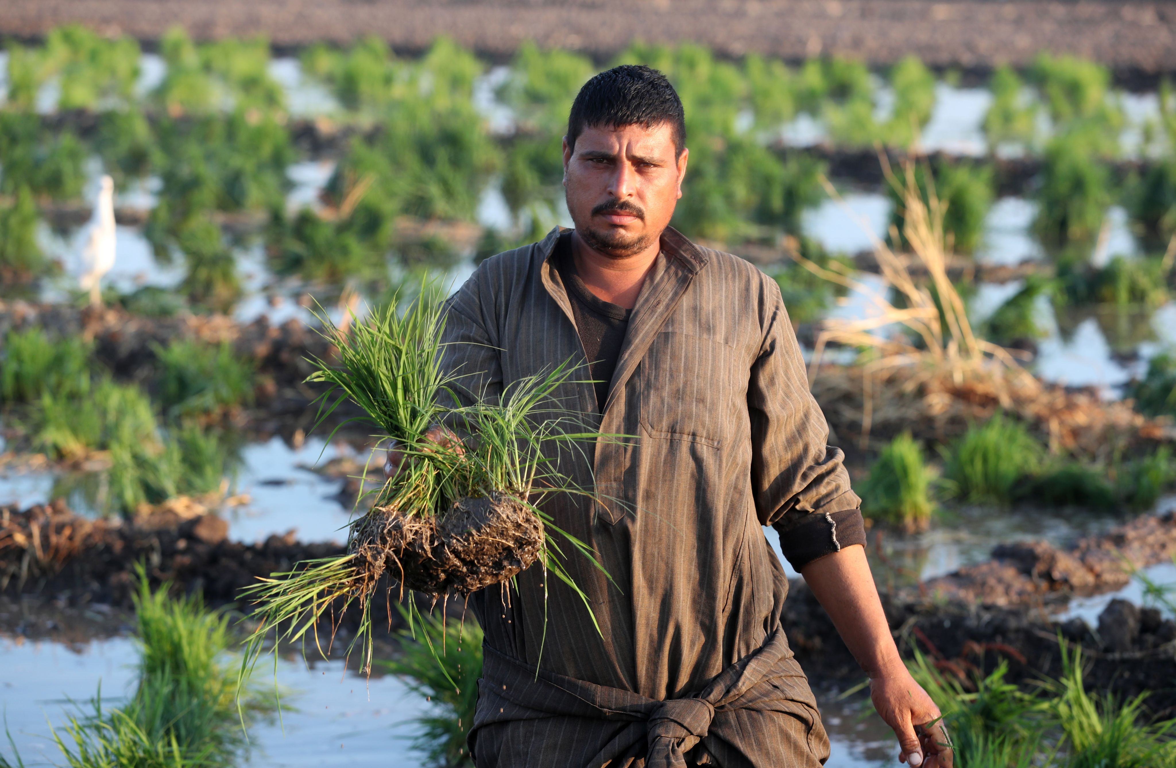 A farmer plants rice seedling in Egypt's fertile Delta in Tanta in June 2022. EPA