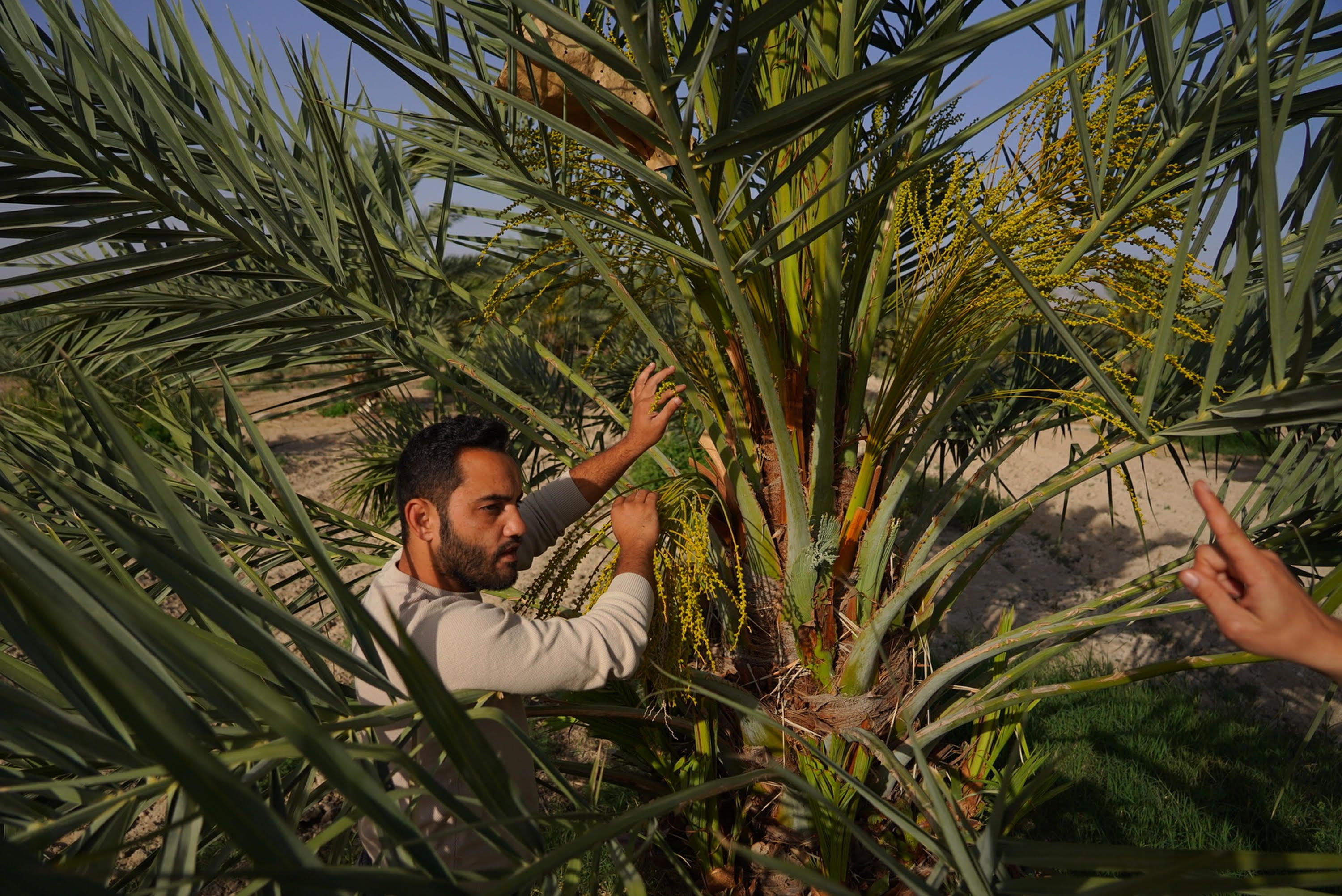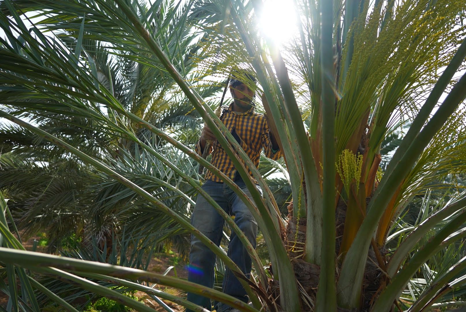 A worker tends to a date palm on a farm in Jordan. Photo: Tadros Farms