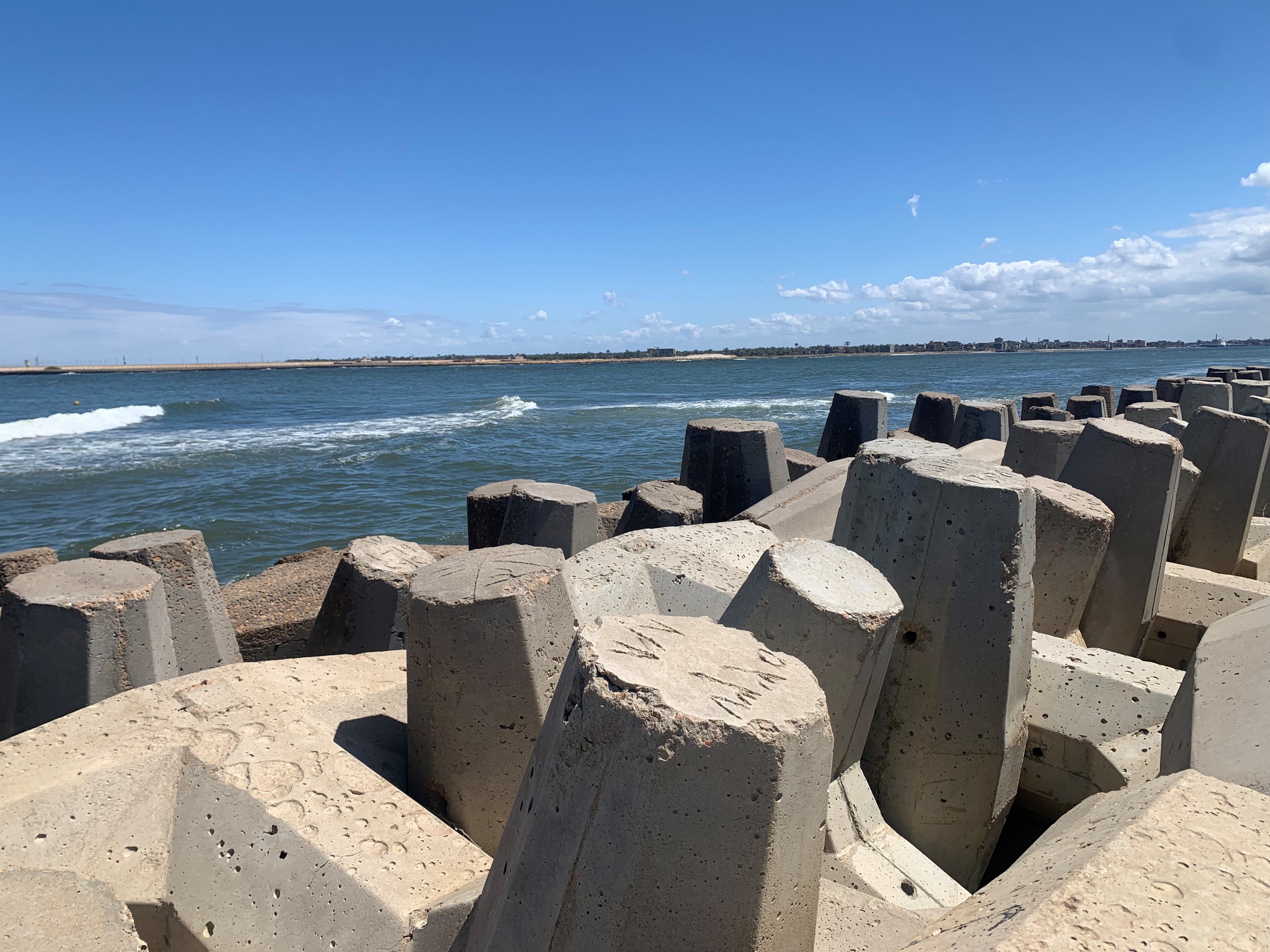 Row after row of foreboding concrete barriers are placed close to the shore at the point where the river meets the Mediterranean. Installed in the 1980s and 1990s, their function is to stop, or at least slow, the process of coastal erosion as a result of the advancing sea.