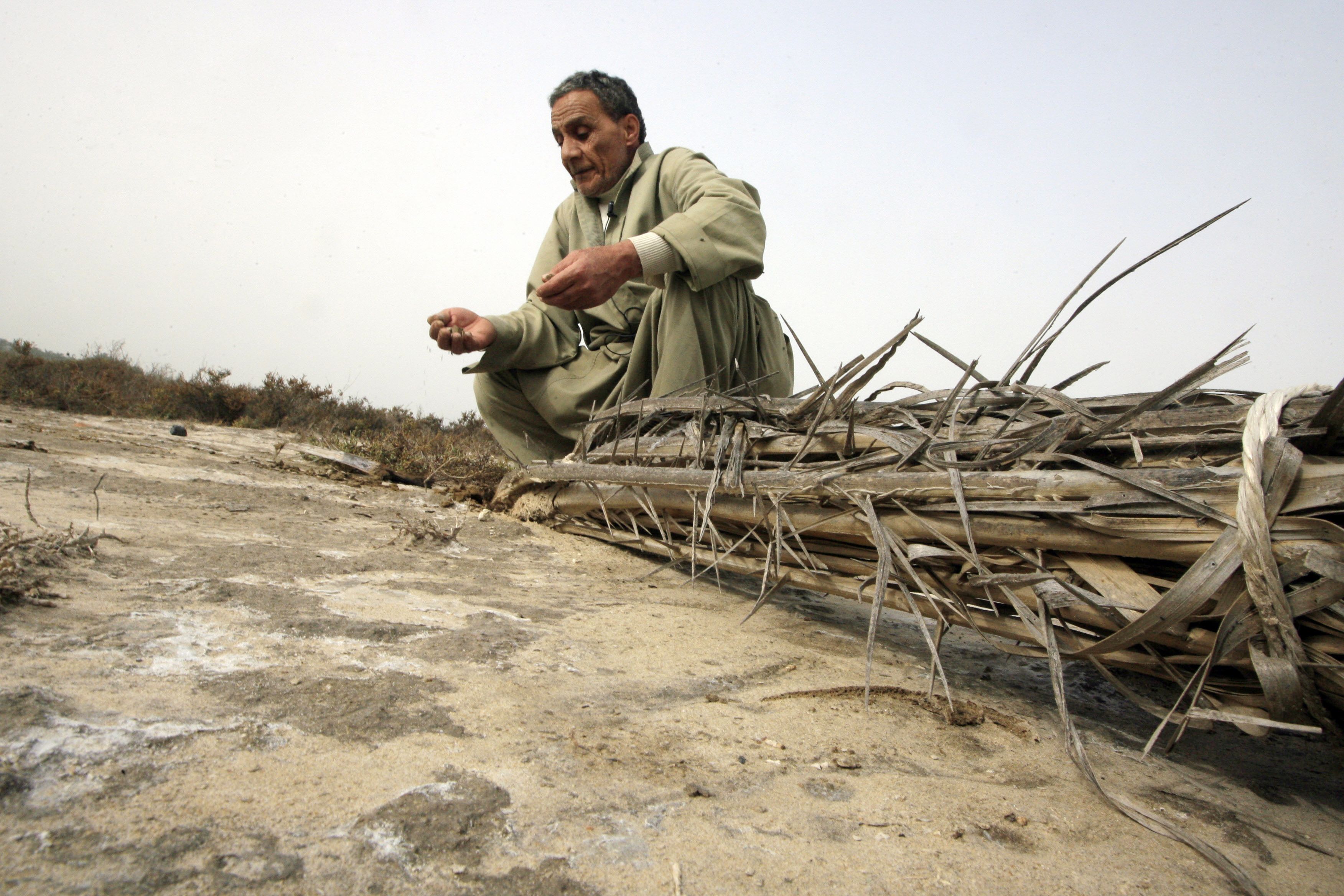 A farmer surveys the salt in the soil of his land in Rosetta in 2009. AFP