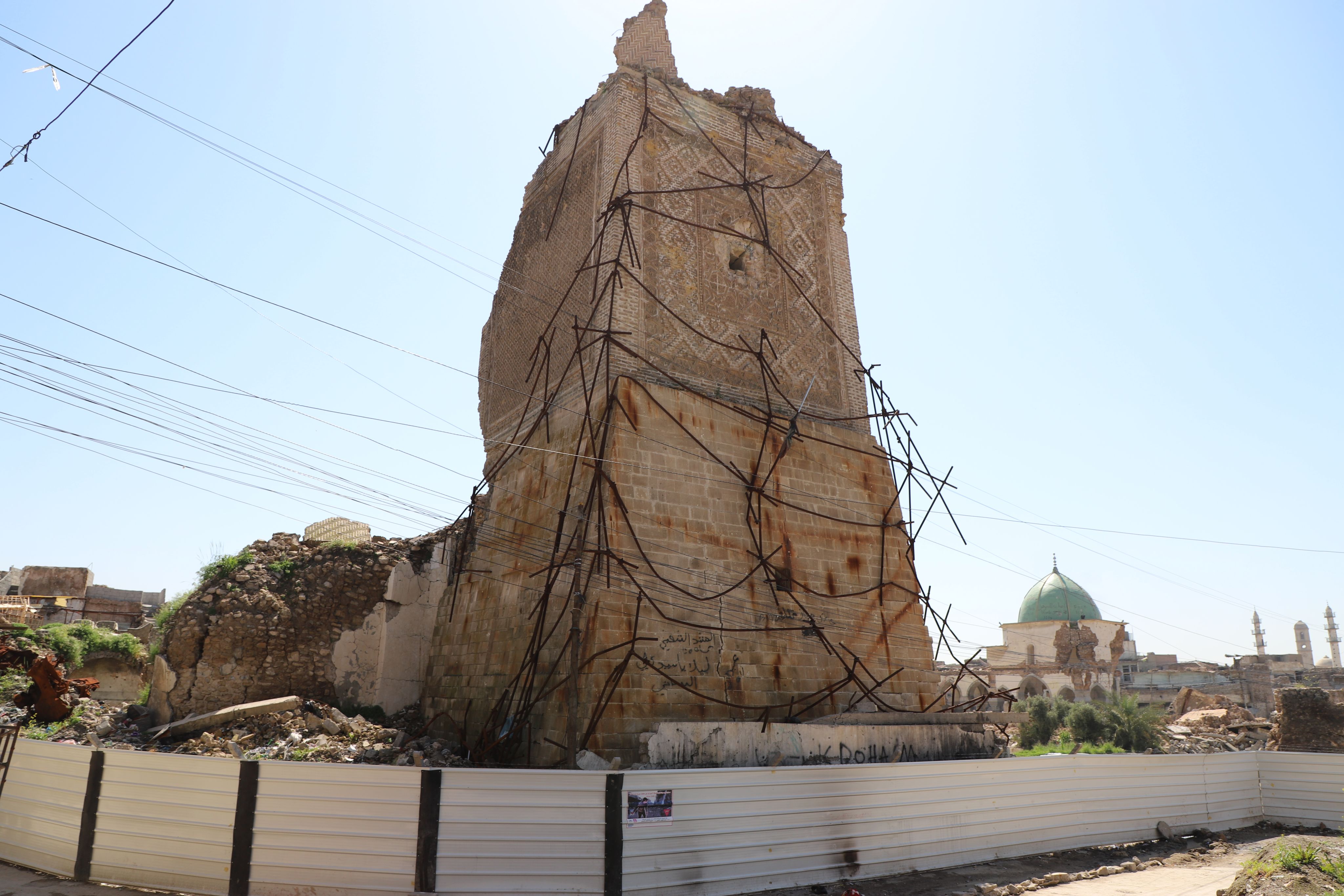 Reconstruction work begins on Al Hadba minaret with the fencing off of the area and placement of reinforcements in March 2019. Photo: Unesco