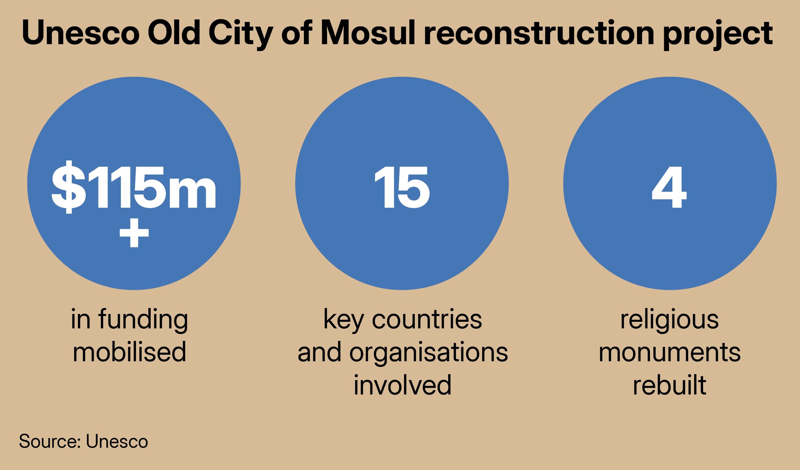 The UAE donated $50.4 million to restore Al Nuri Mosque and its Al Hadba minaret, as well as Our Lady of the Hour Convent, its House of Prayer and Al Tahera Church. The total amount mobilised for project was $115 million.