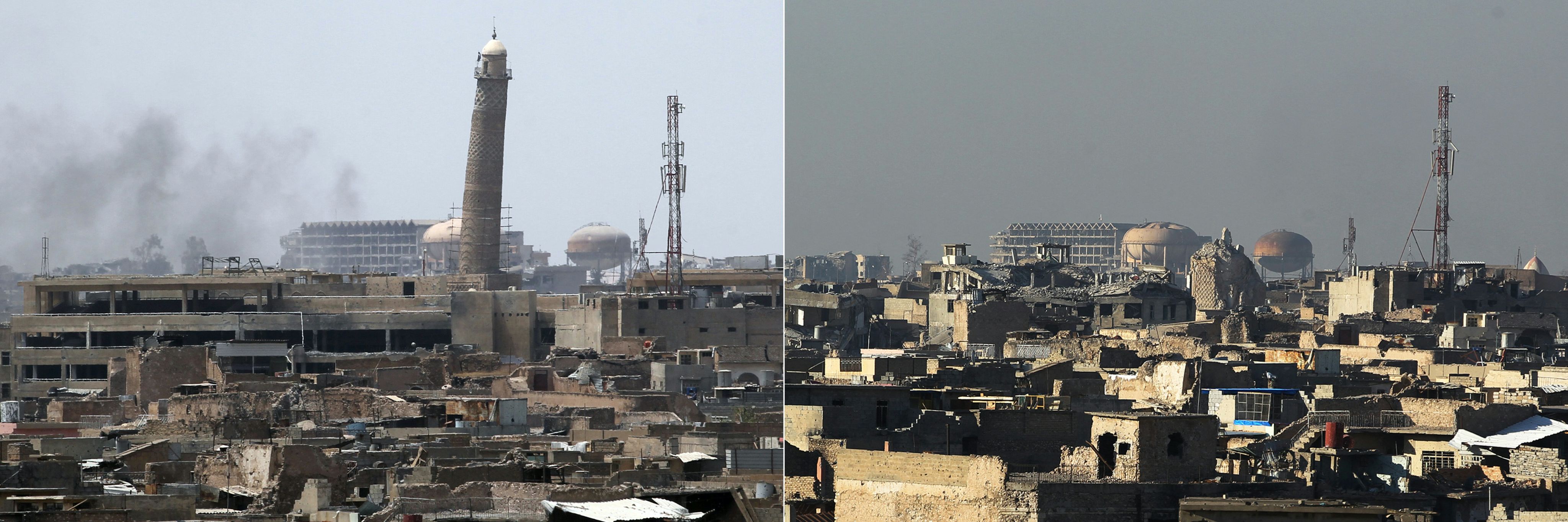 The leaning Al Hadba Minaret pictured in June 2017, left, and the same site in January 2018 after ISIS destroyed the landmark during the group's retreat from Mosul. AFP