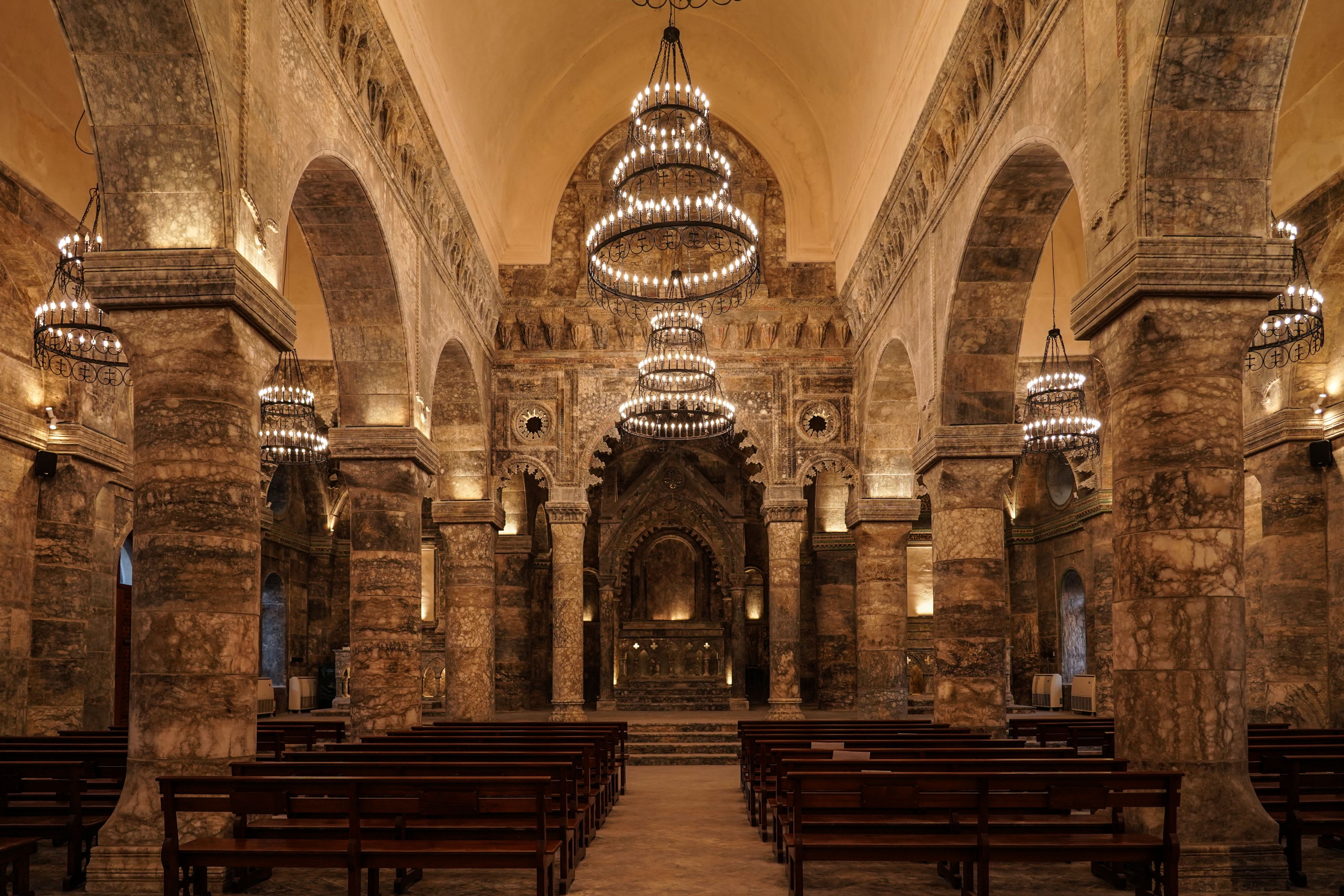 The newly rebuilt and furnished church was designed to blend tradition with modern elegance, creating a serene and sacred atmosphere for worshippers. The high-vaulted ceiling soars high above, with part of the walls adorned with floral designs, carved by sculptors from Mosul. The altar itself is beautifully carved, made of marble stone and alabaster, with chandeliers hanging from the ceiling above rows of new wooden benches.