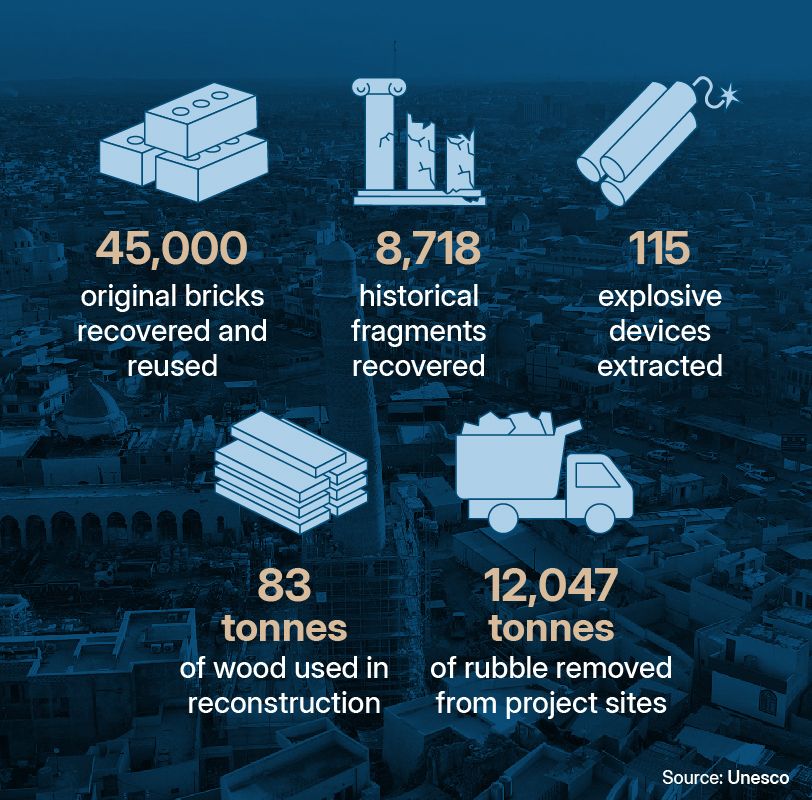 From the beginning, the project faced numerous challenges. Thousands of tonnes of rubble had to be carefully removed and sifted through to search for salvageable pieces that could be used in the reconstruction. Workers also had to remove dangerous ordnance, including an unexploded bomb found beneath the dome of Al Nuri Mosque.