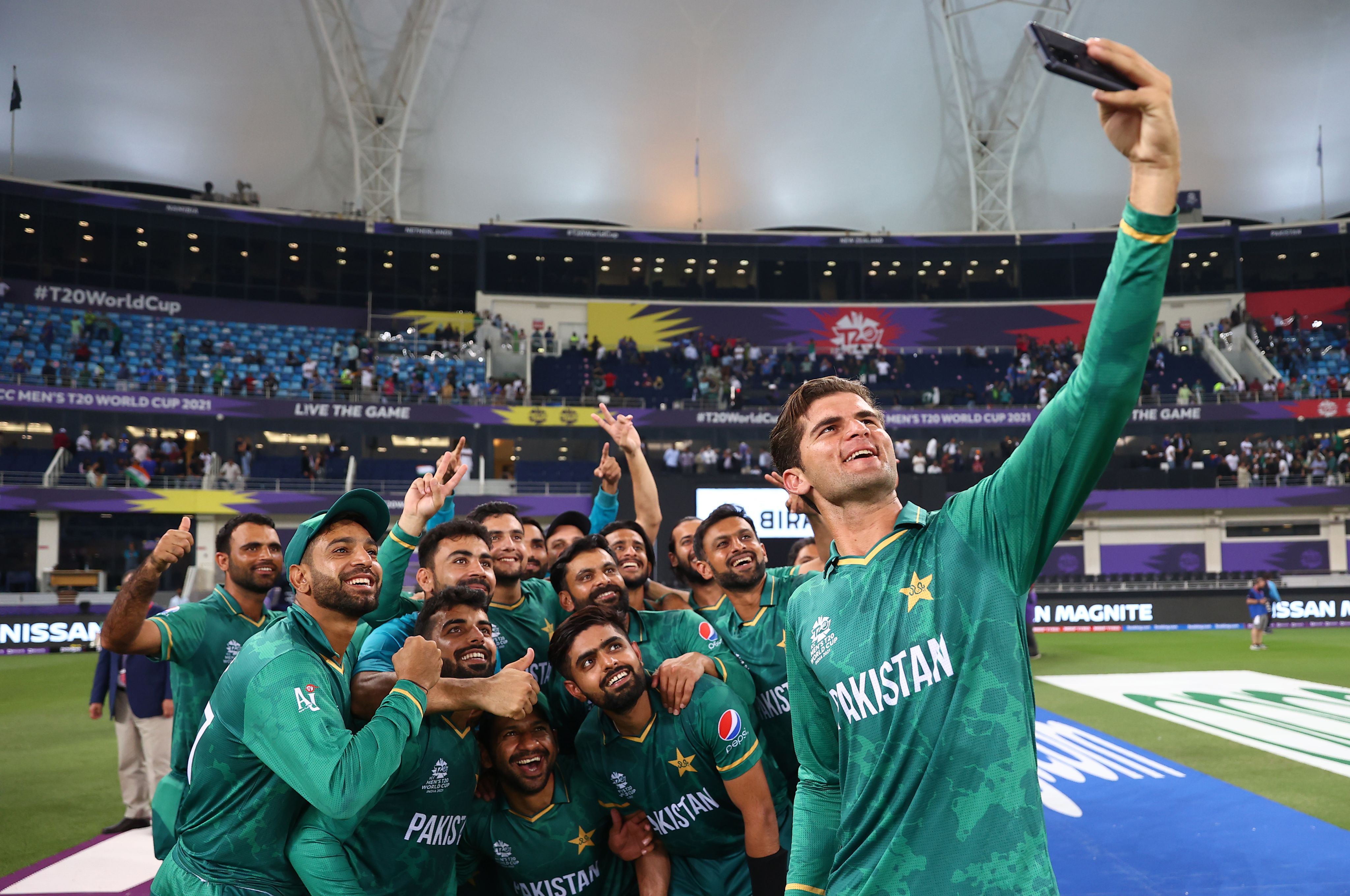 Shaheen Afridi takes a selfie with his teammates after winning the T20 World Cup against India in Dubai in October 2021. Getty