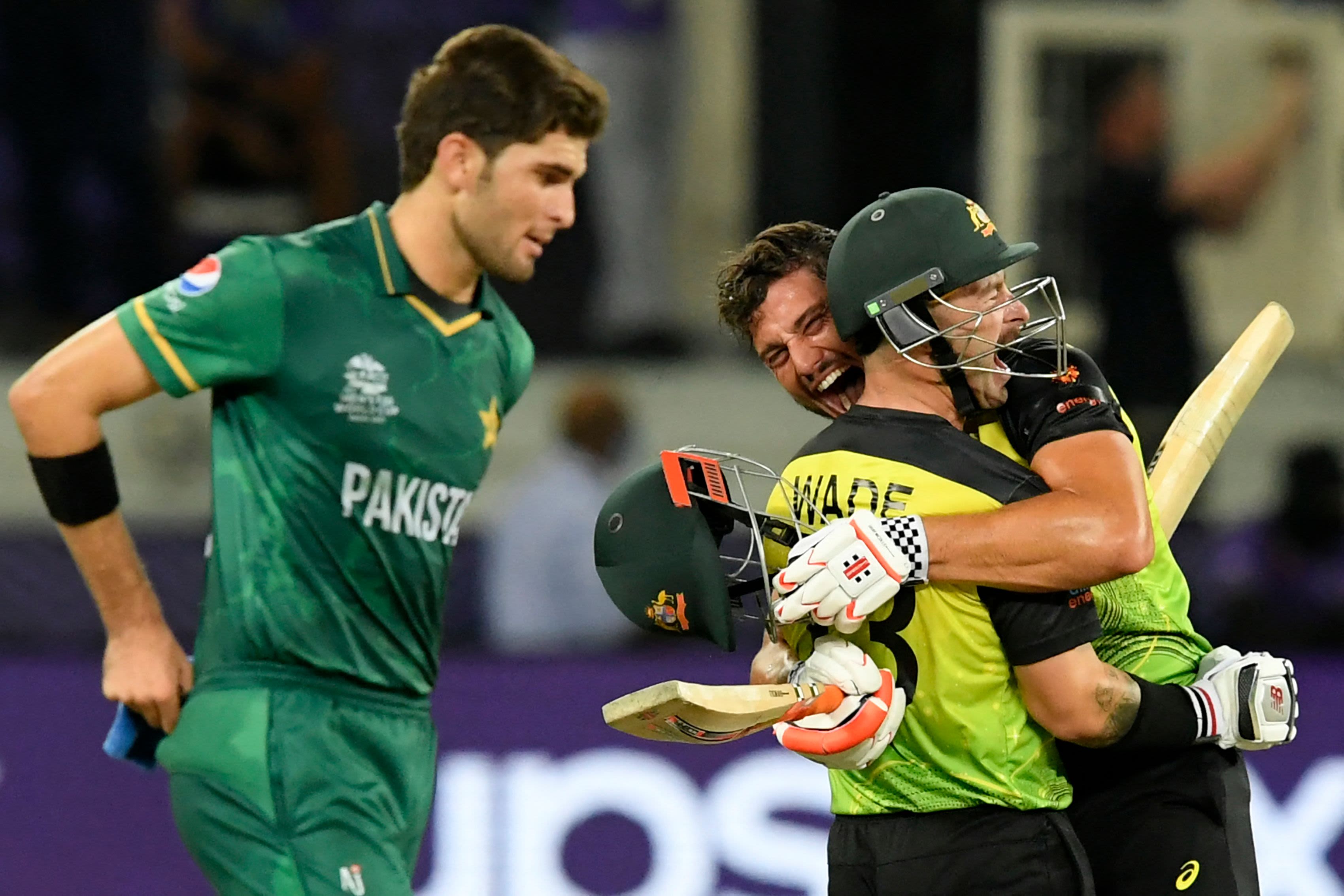 Australia's Marcus Stoinis and Matthew Wade celebrate their victory as Shaheen Afridi looks on during the T20 World Cup semi-final in Dubai in November 2021. AFP