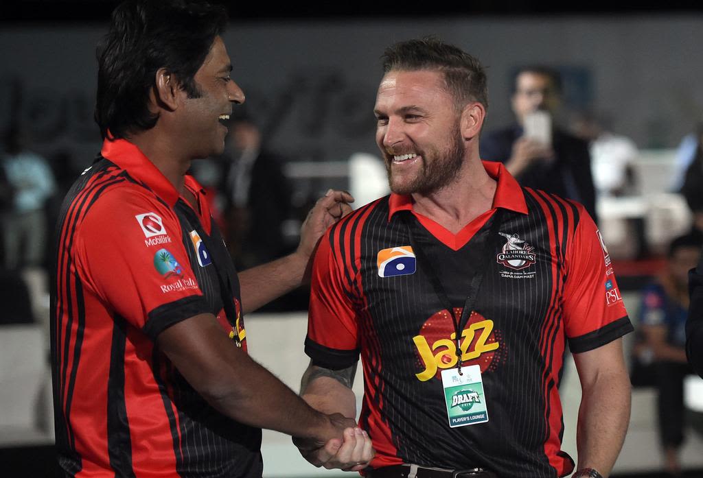 Aaqib Javed, Lahore Qalandars director and former UAE coach, shakes the hand of Brendon McCullum, the former team captain. AFP
